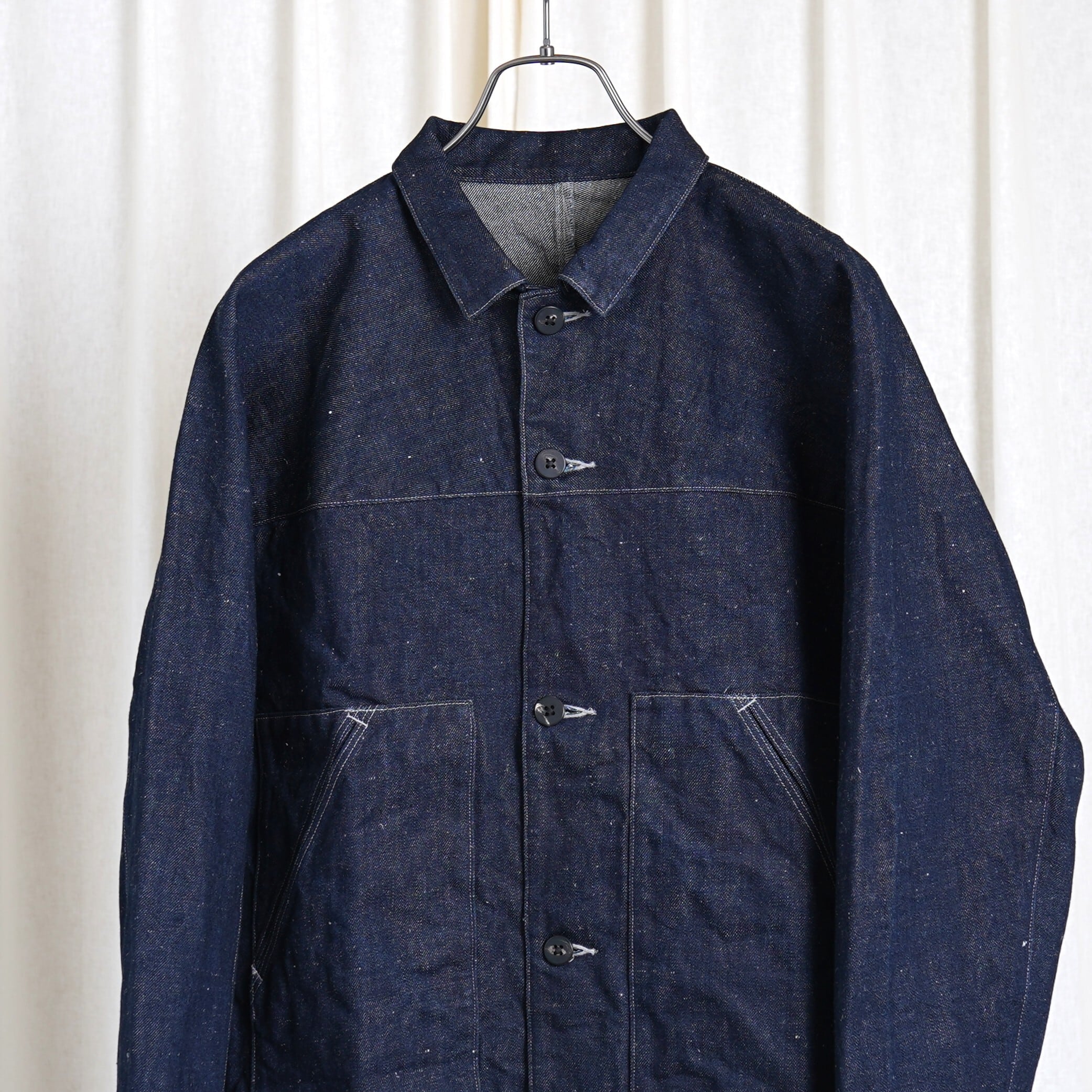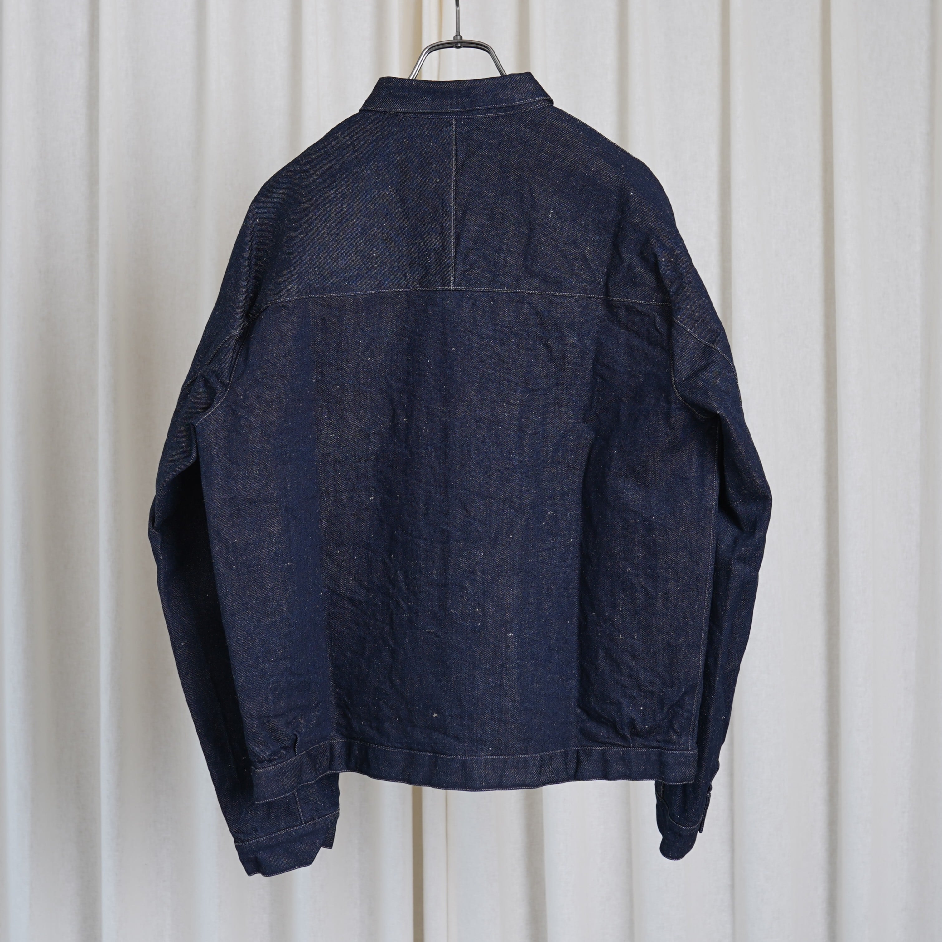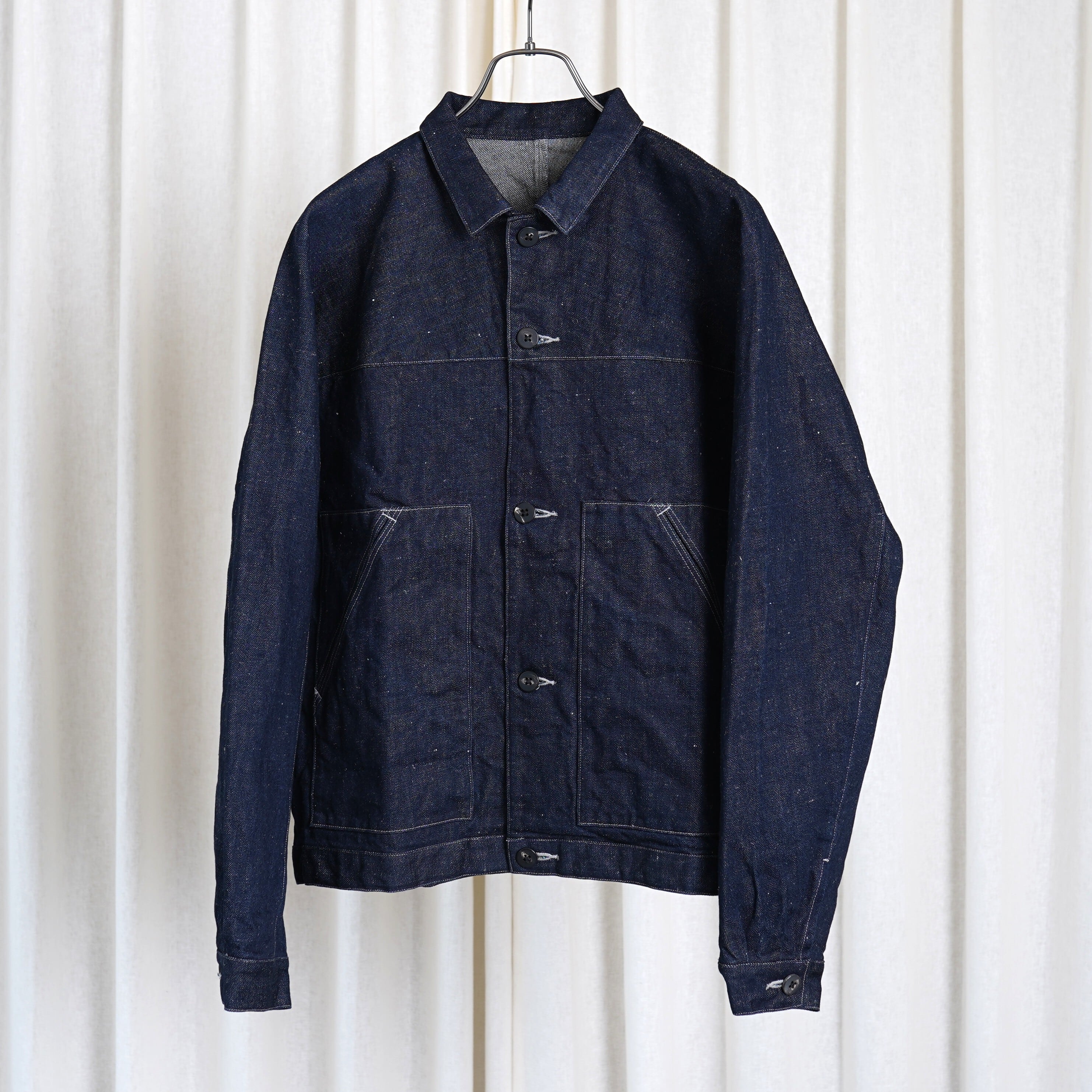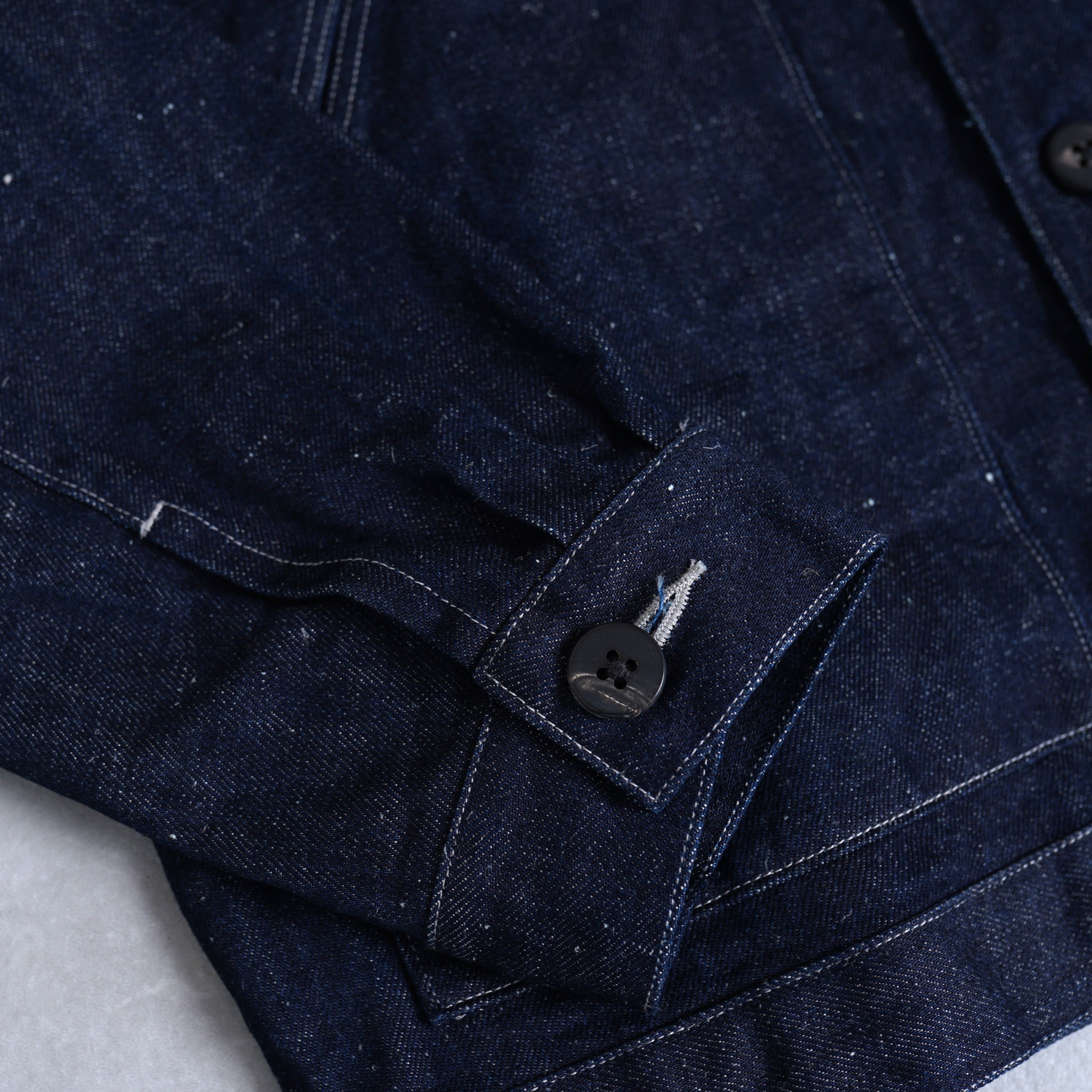ワークウェアの文脈を踏まえながら既存の洋服としてのデニムジャケットを踏襲せず、日常の道具としての再定義しました。利便性を考慮したポケット配置に加え、腕周りの可動域を確保するヨークスリーブパターンを採用することで機能と耐久性を意識しています。金属パーツを使わず水牛の角のボタンを採用しています。