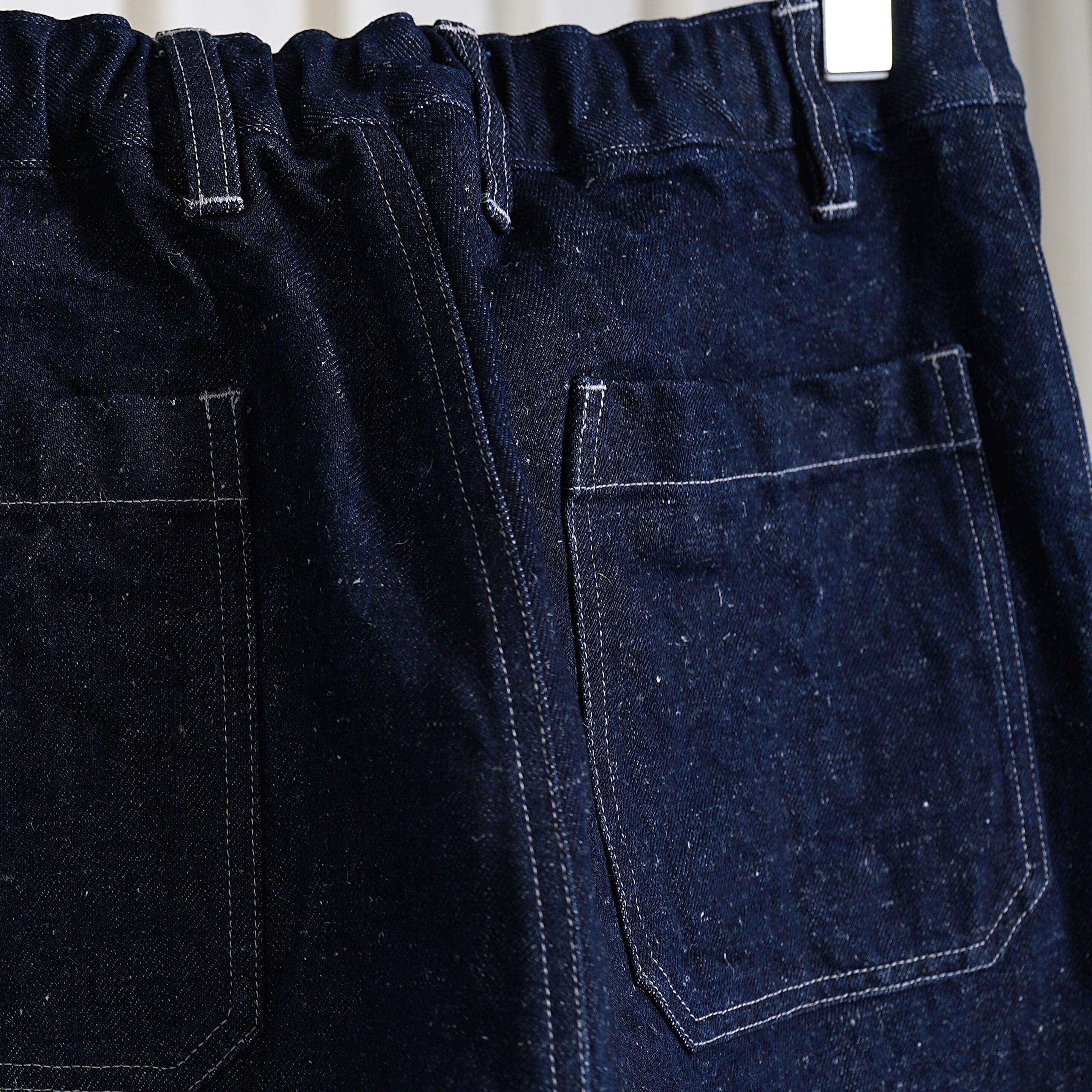 ワークウェアの文脈を踏まえながら既存の洋服としてのジーンズを踏襲せず、日常の道具として再定義しました。後ろウエストベルトには伸縮素材、股下にマチを配して可動域を確保し、本体脇と内股はロックミシン仕様にすることで、生地の負担を減らしながら修理しやすさを担保しています。大麻の残布をポケット布に採用し、金属パーツを使わず水牛の角のボタンを採用しています。
