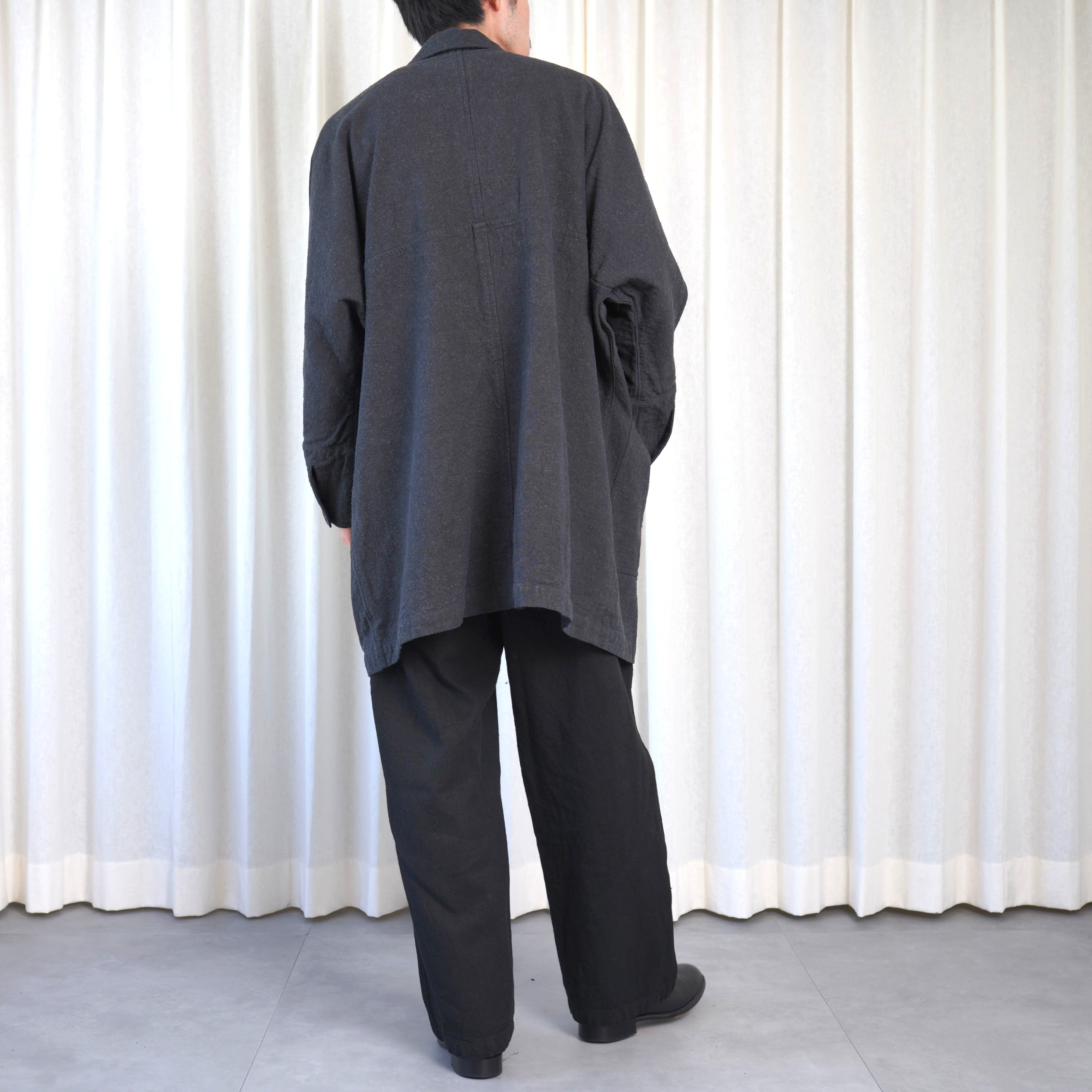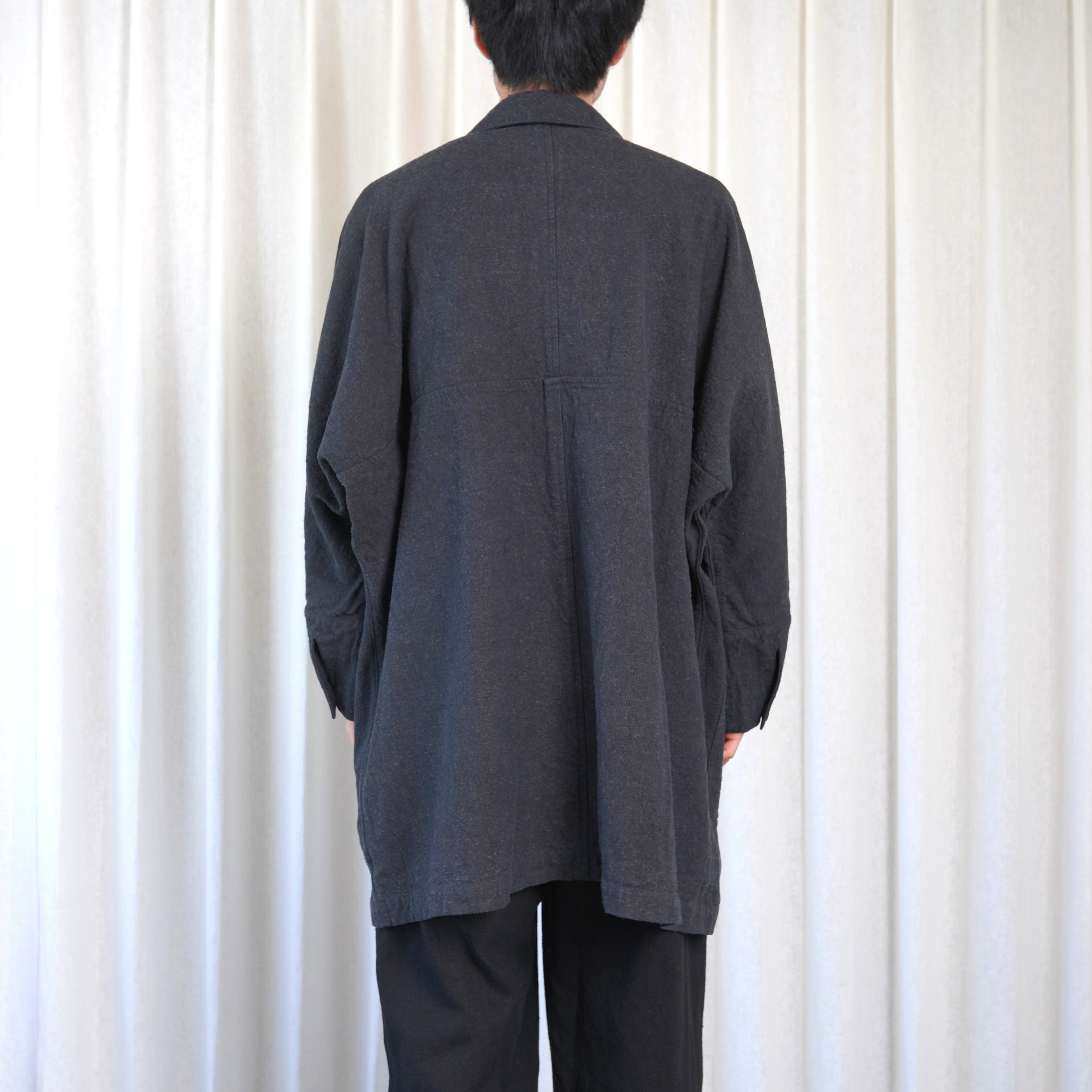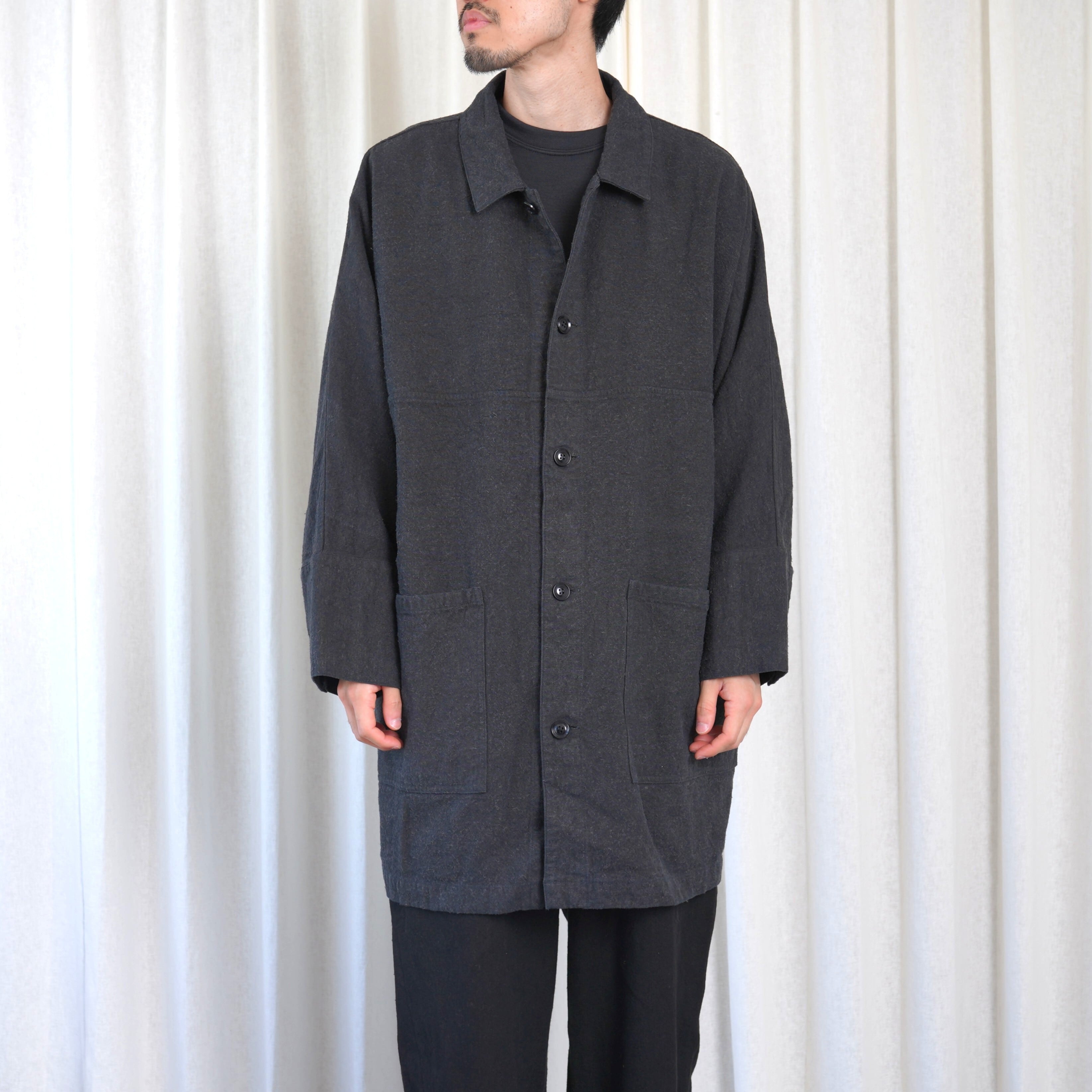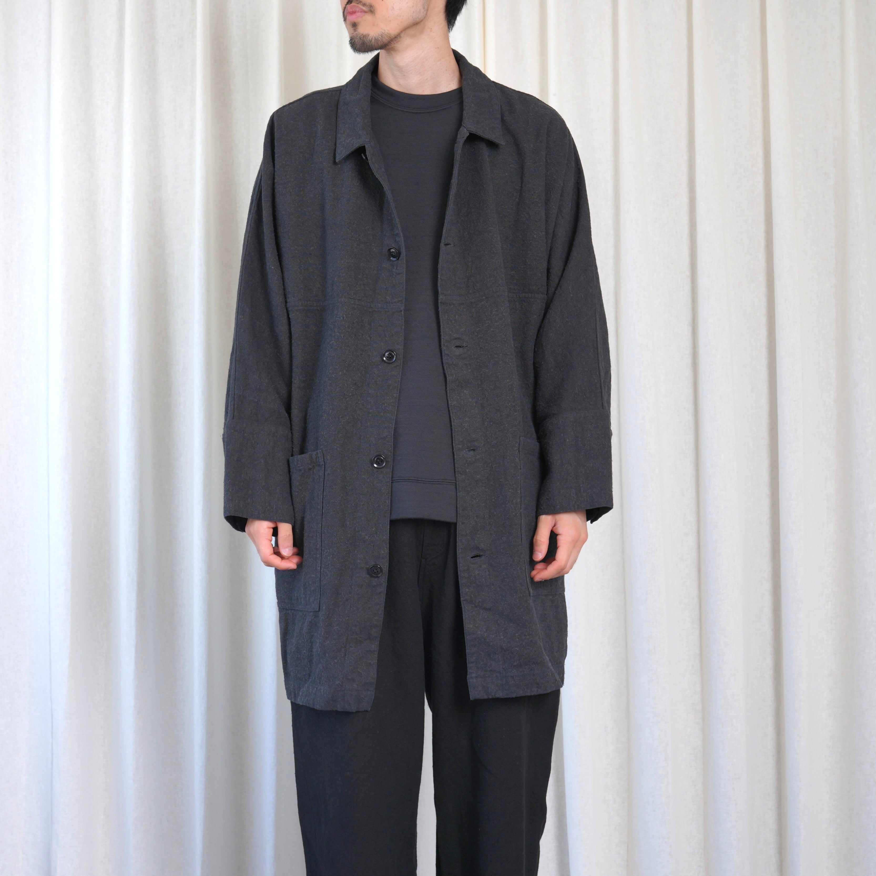 ほとんどのパーツを直線で構成した、平面的なパターン設計が特徴のコートです。袖下に裁ち続きのマチを配した、全体的にゆったりとしたシルエットで、中に着るものに左右されず羽織ることができます。裏面のパイピングテープにはオーガニックコットンを、ボタンには環境負荷の少ないナットボタンを採用しています。
