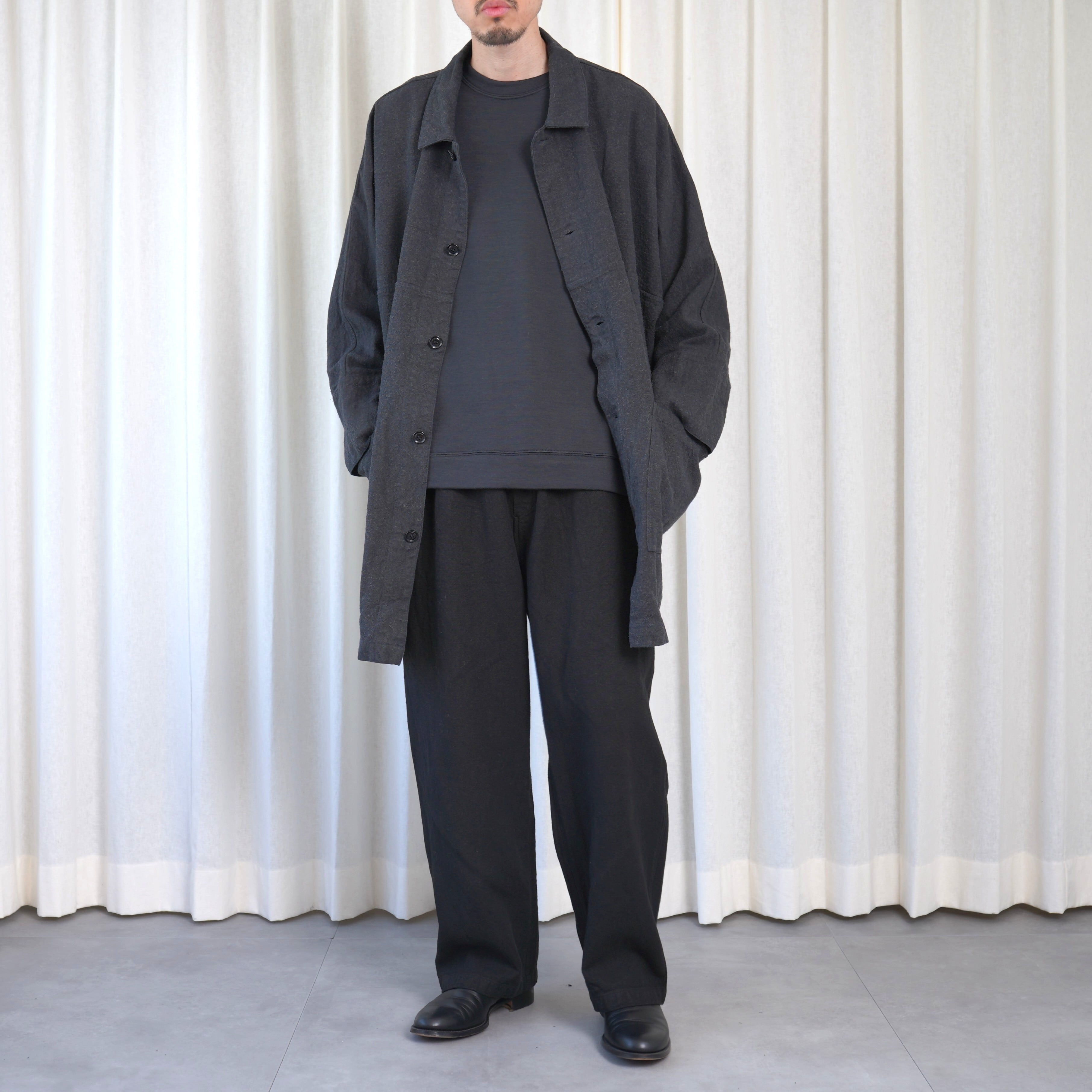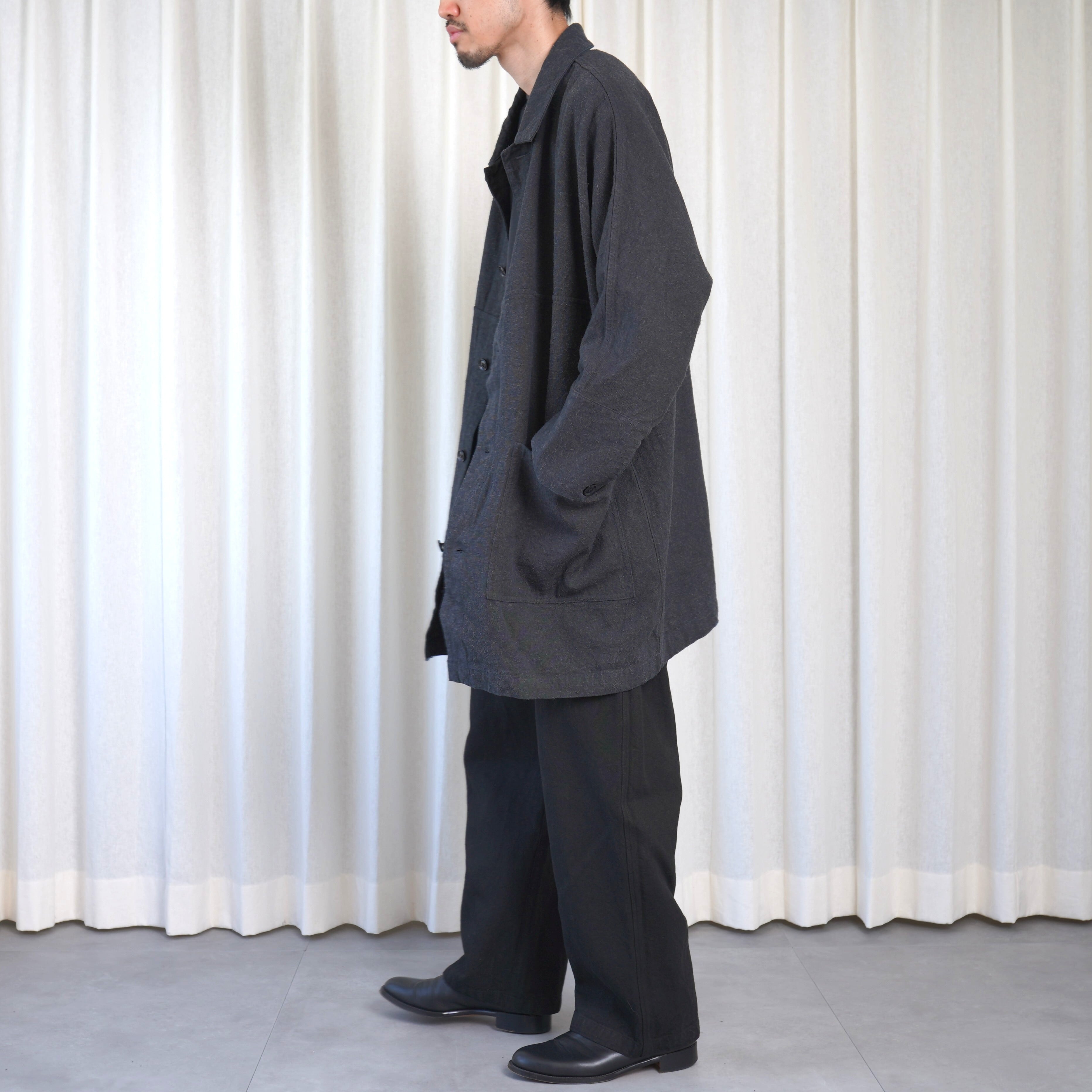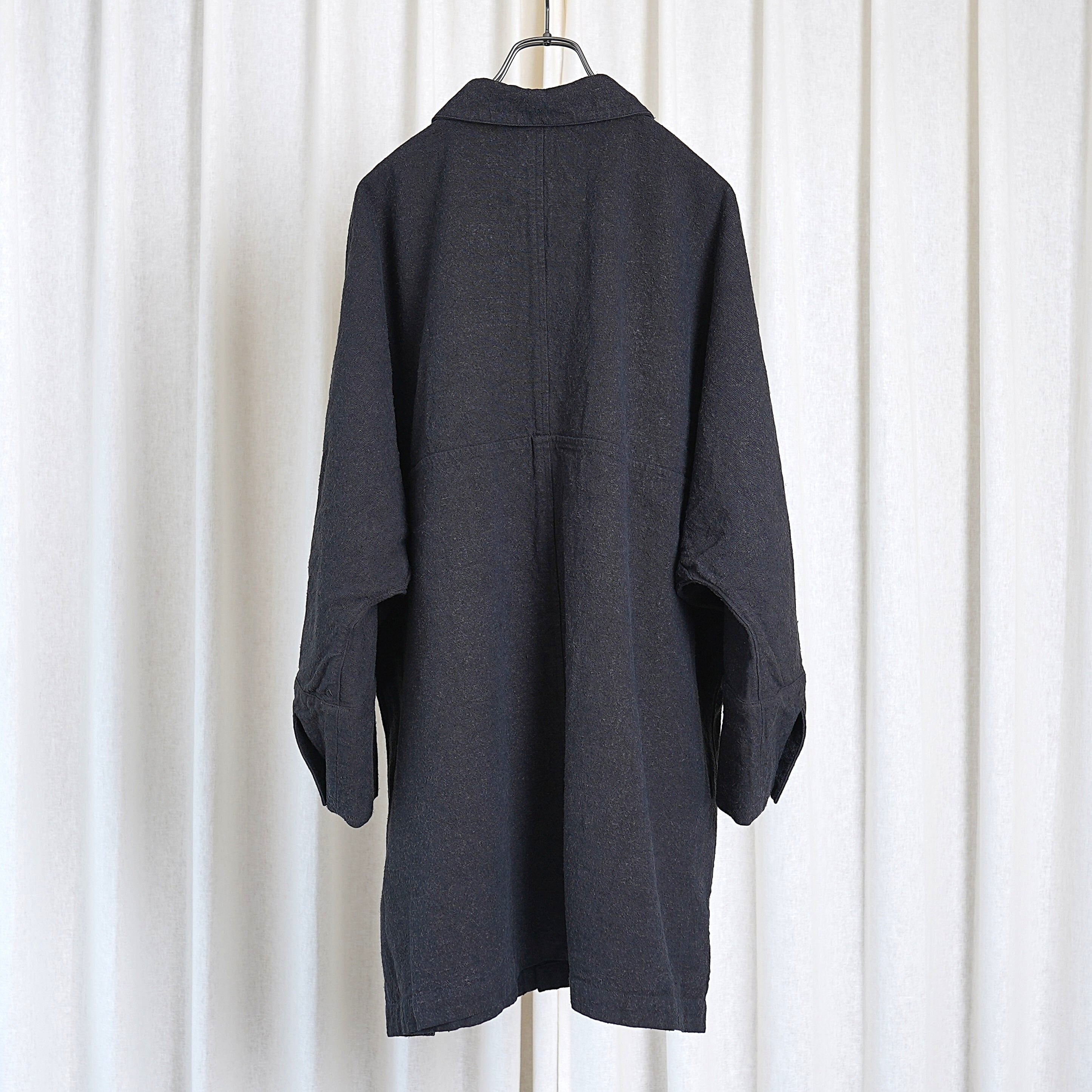 ほとんどのパーツを直線で構成した、平面的なパターン設計が特徴のコートです。袖下に裁ち続きのマチを配した、全体的にゆったりとしたシルエットで、中に着るものに左右されず羽織ることができます。裏面のパイピングテープにはオーガニックコットンを、ボタンには環境負荷の少ないナットボタンを採用しています。