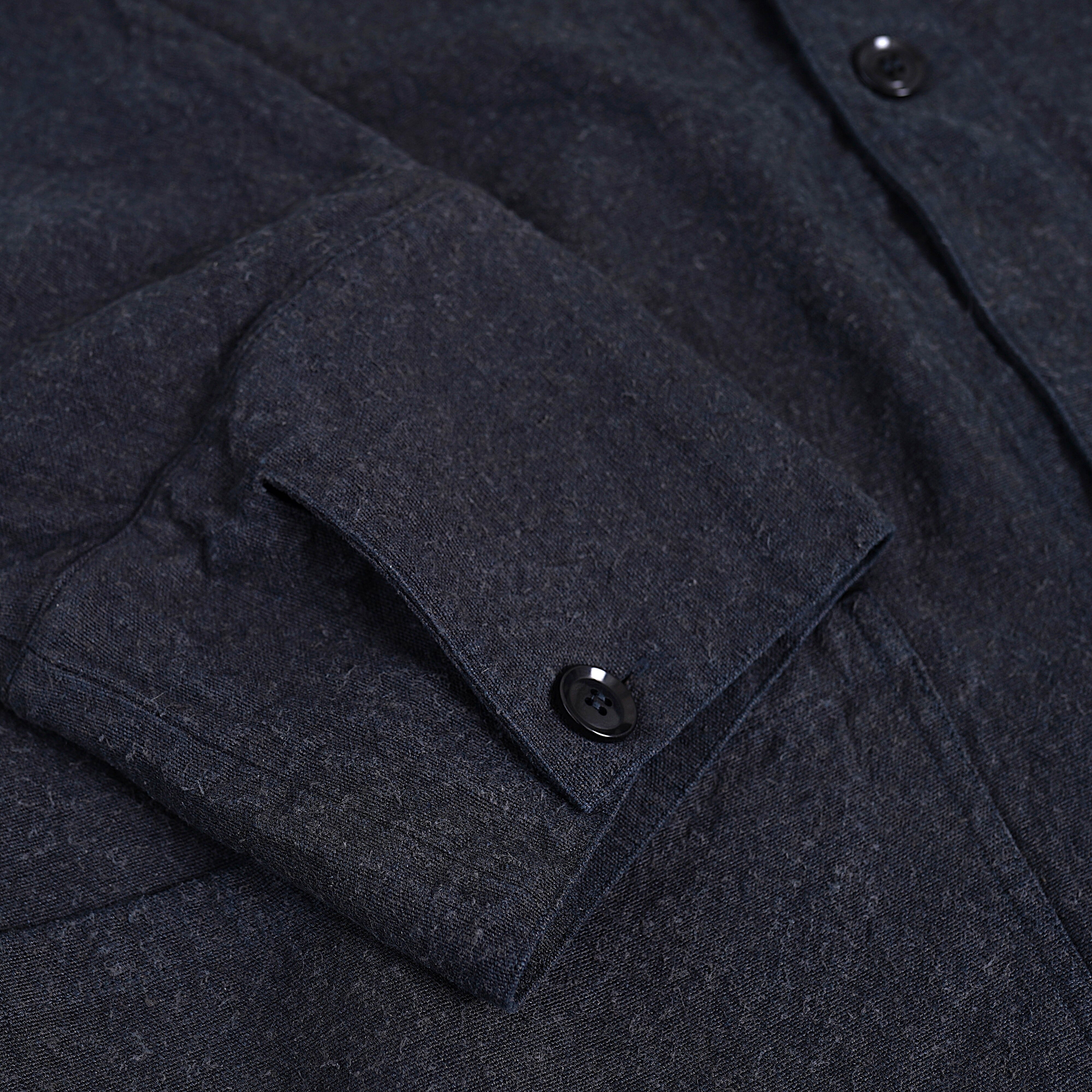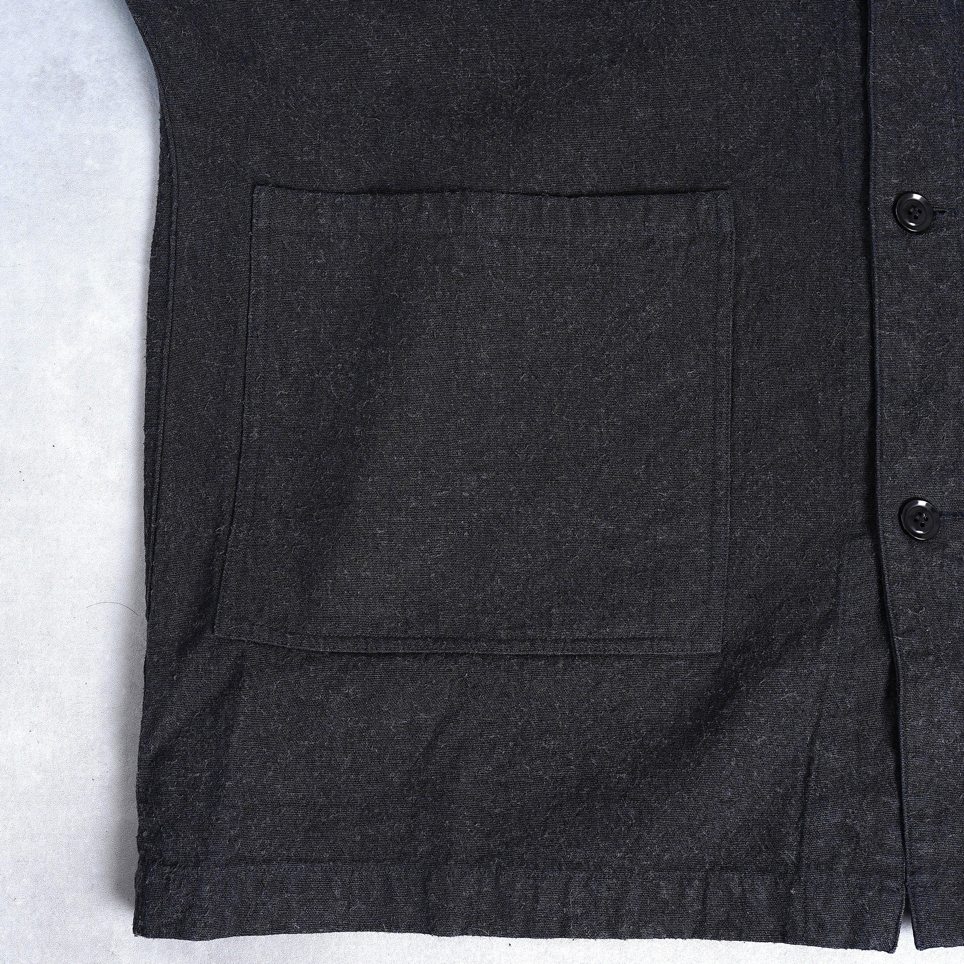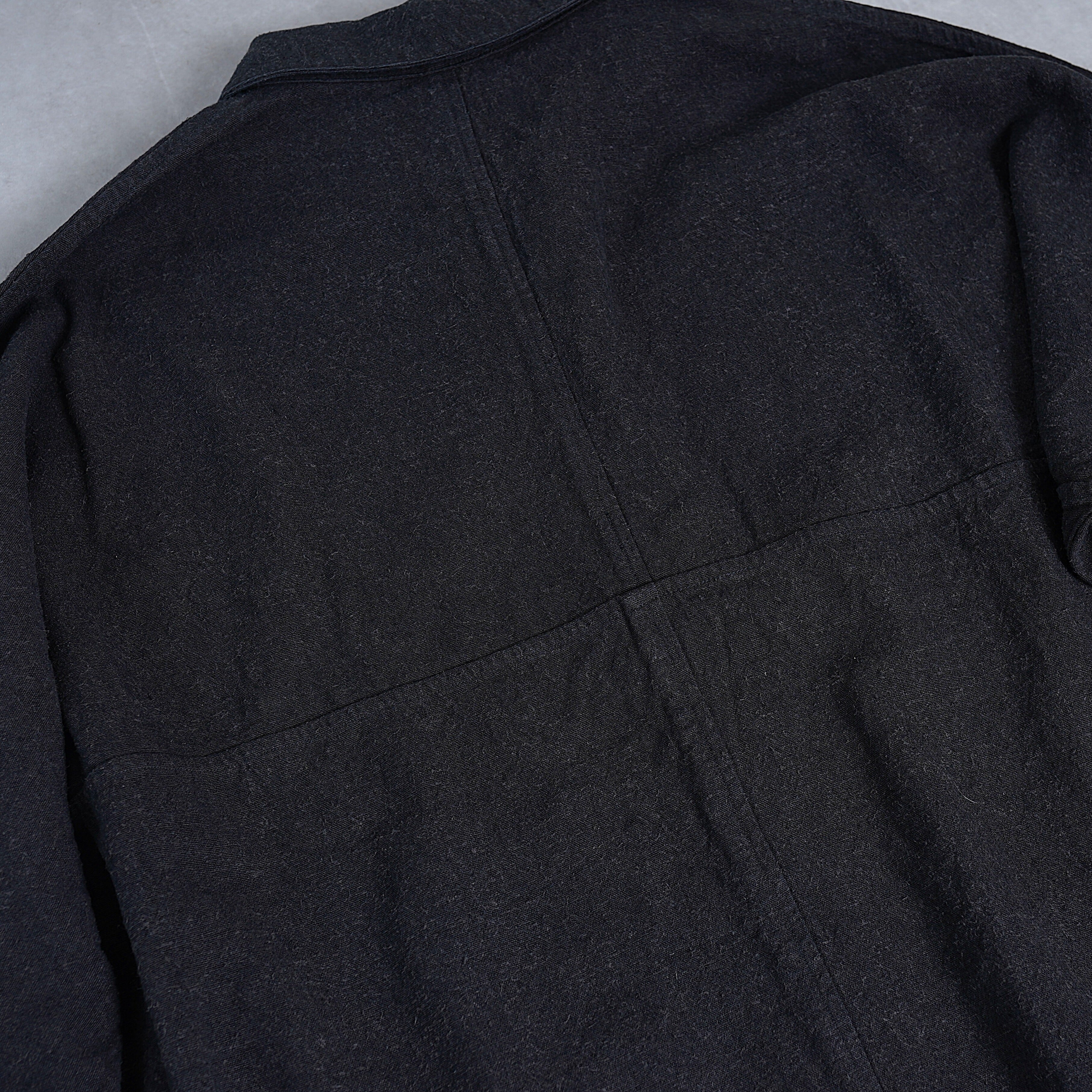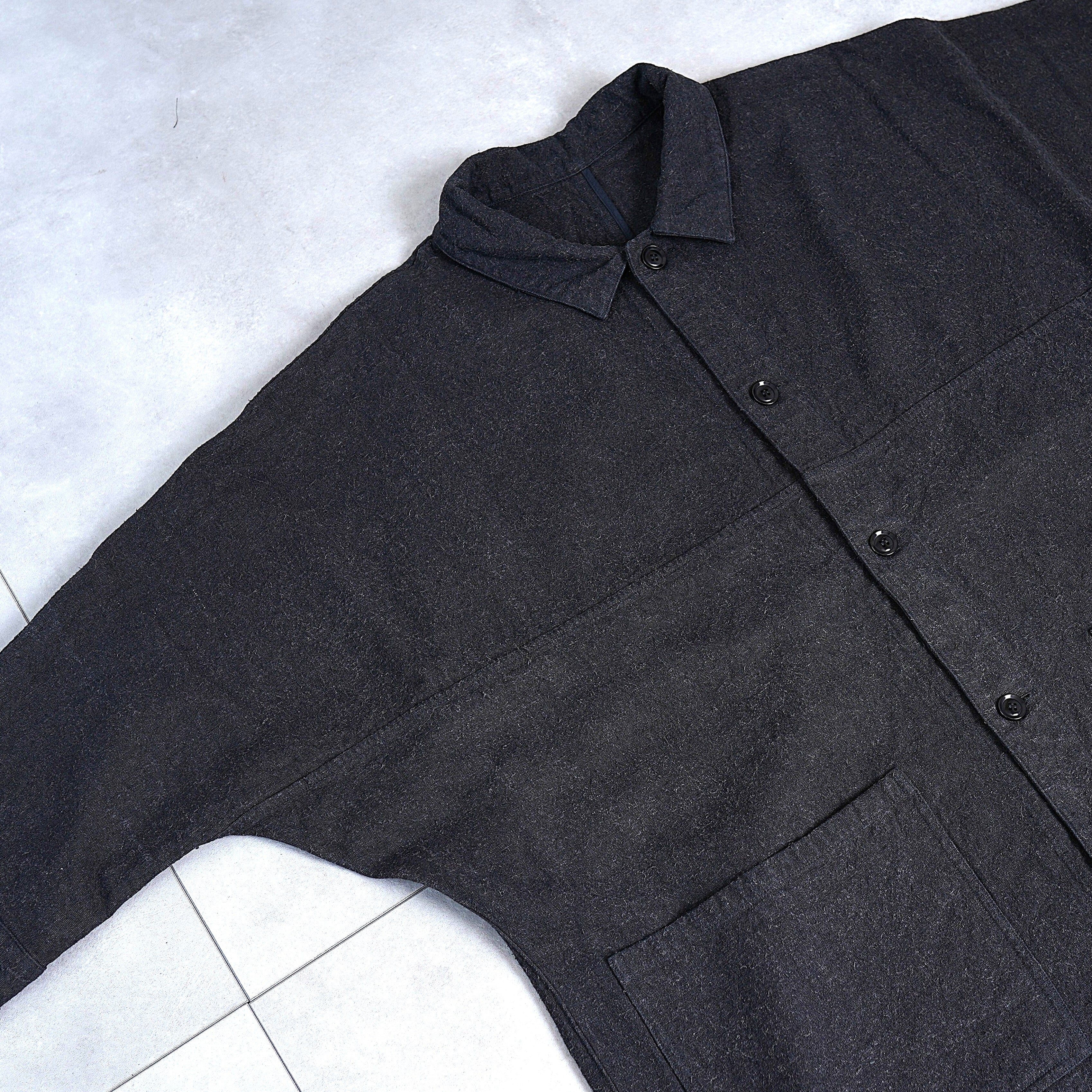 ほとんどのパーツを直線で構成した、平面的なパターン設計が特徴のコートです。袖下に裁ち続きのマチを配した、全体的にゆったりとしたシルエットで、中に着るものに左右されず羽織ることができます。裏面のパイピングテープにはオーガニックコットンを、ボタンには環境負荷の少ないナットボタンを採用しています。