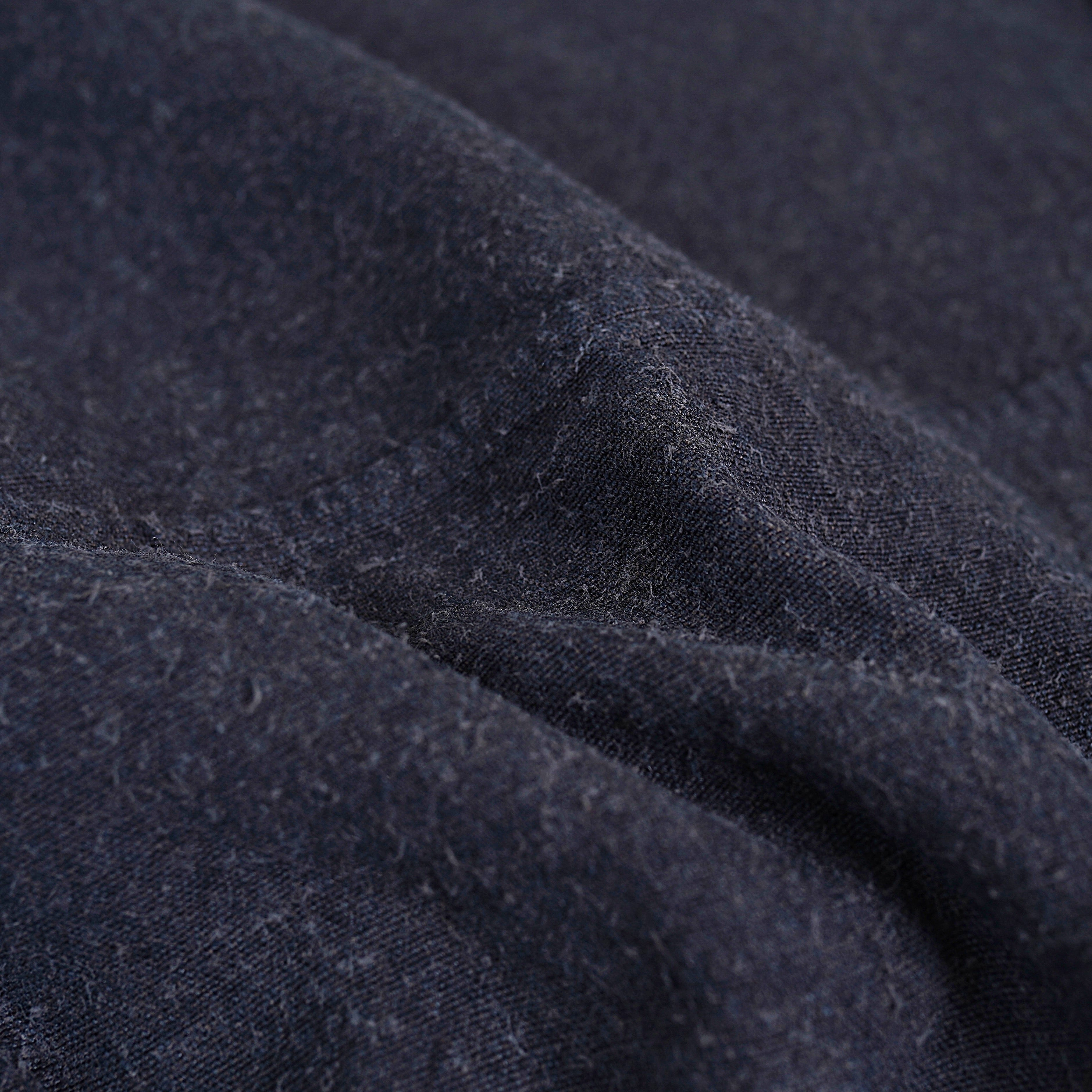 経糸には二種類の麻、亜麻(リネン)と苧麻(ラミー)の国内紡績の混紡糸を使用し、緯糸にはシルクを使用したオリジナルの生地を採用しています。亜麻独特のたわみ感が苧麻と混紡されることで軽減され、さらに緯糸をシルクにすることで肌あたりがやわらかくなり、ネップも出るので初めから着古したような風合いを感じることができます。亜麻・苧麻・大麻の違いはボーケンさんの記事に詳しいので参照ください。