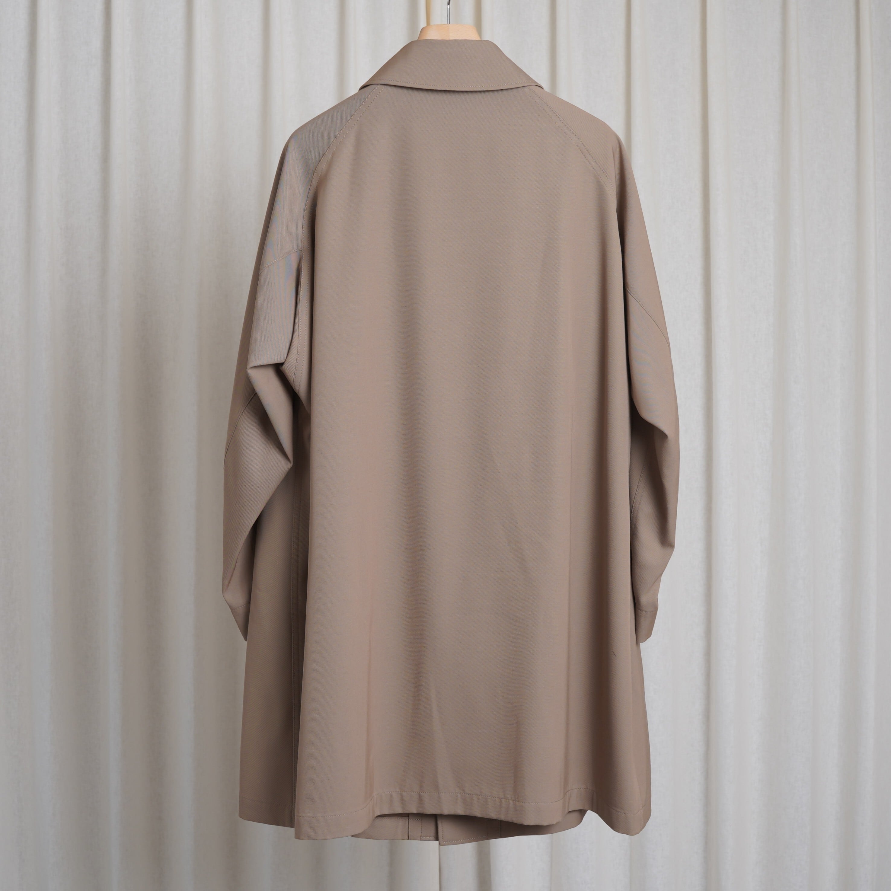 肩線のないラグラン構造によって、生地の分量感をそのまま活かした伸びやかなフォルムが特徴。 歩くたびに優雅に揺れる裾の動き、控えめなAライン、そして襟裏のチンストラップが、実用性とミリタリー由来のディテールを上品に受け継いでいます。
