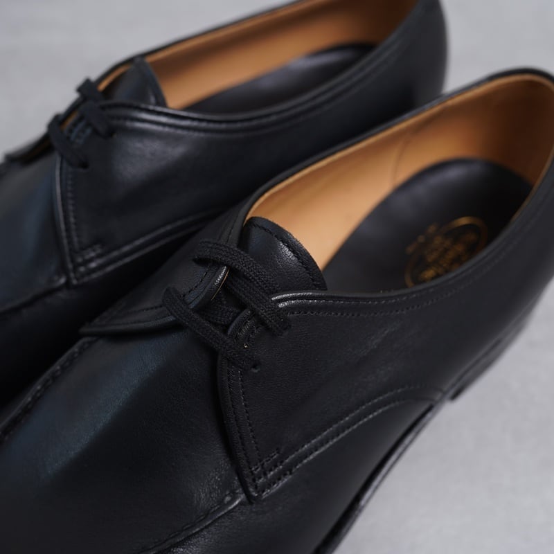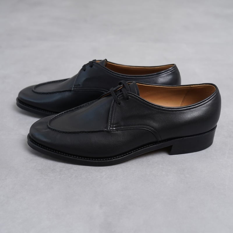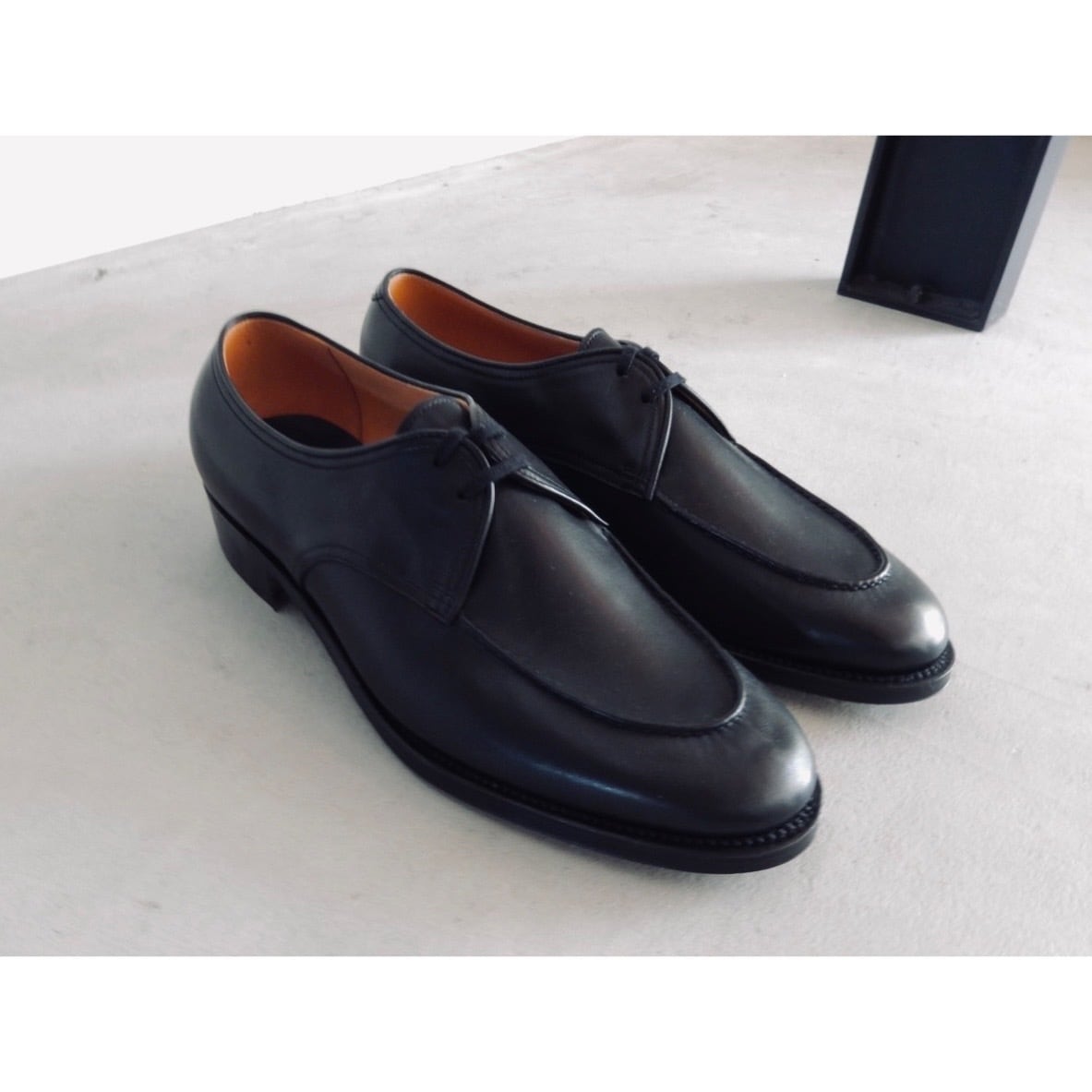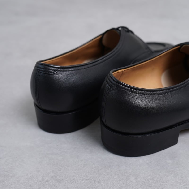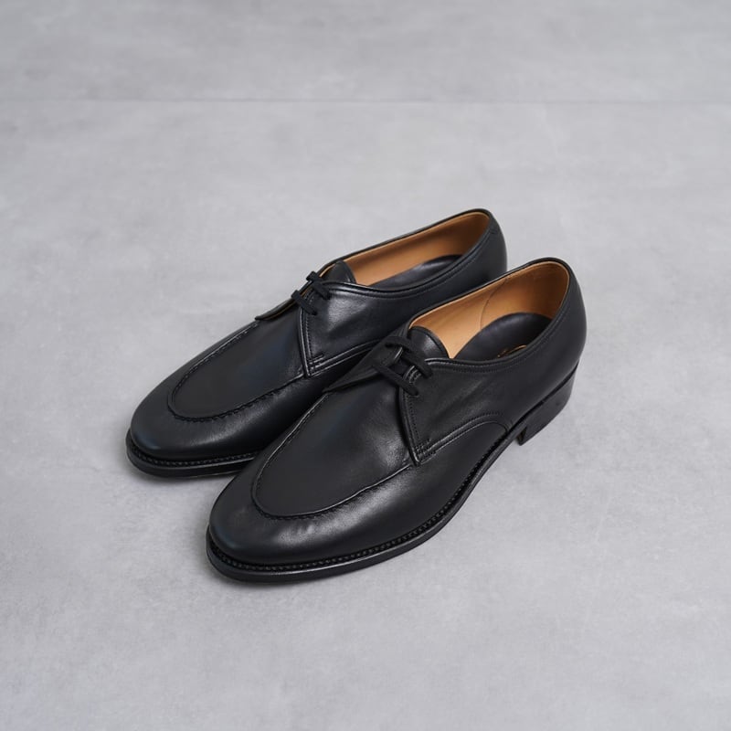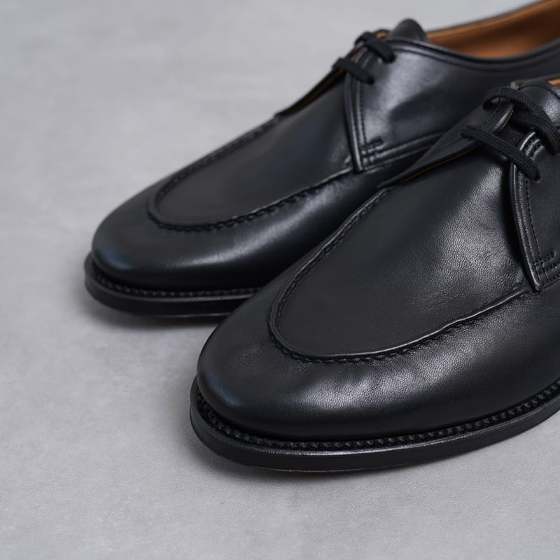 木型No.12を使用したモデルで、シャープなフォルムに低めのトゥながらも、ハンドモカで立体感のある仕上がりが特徴的です。