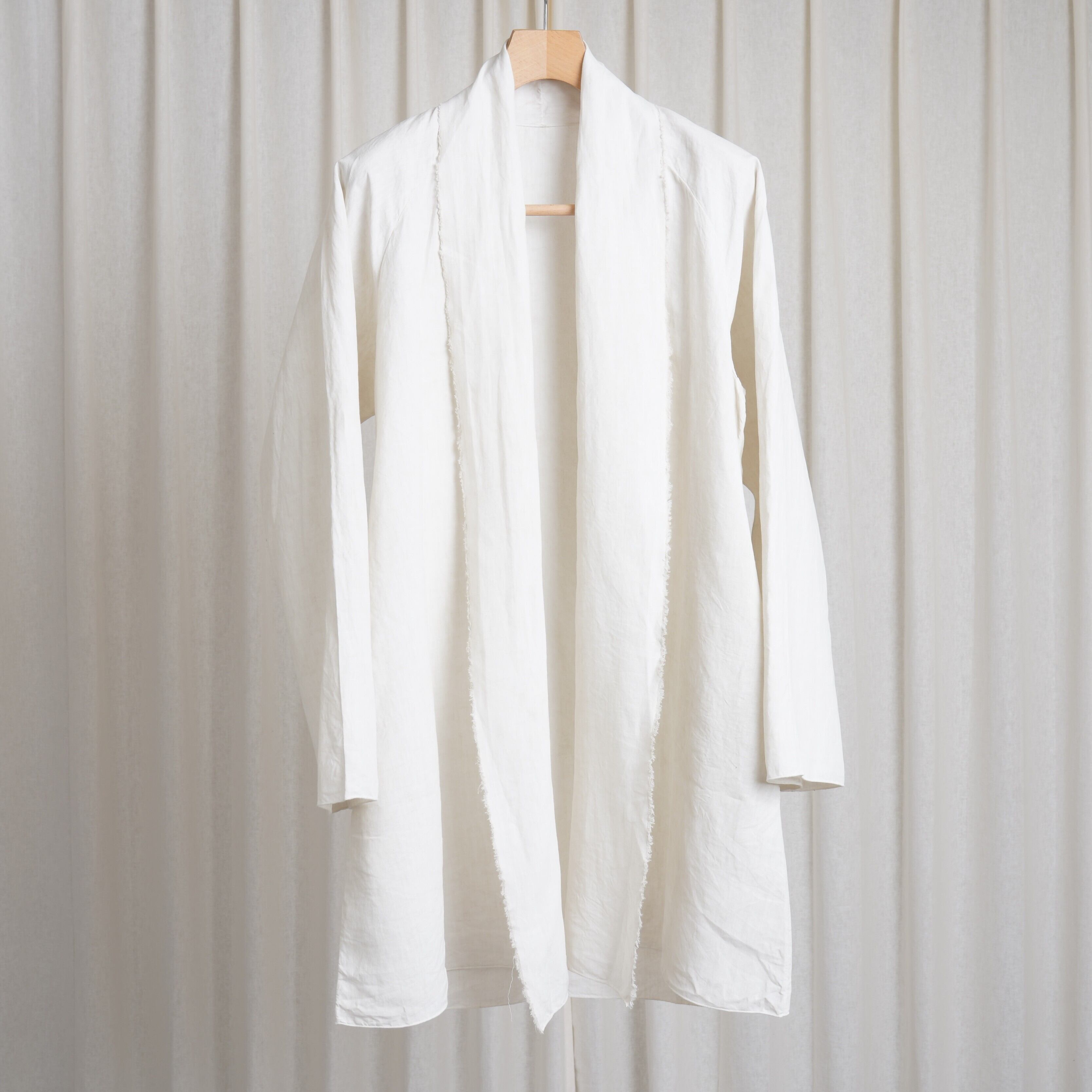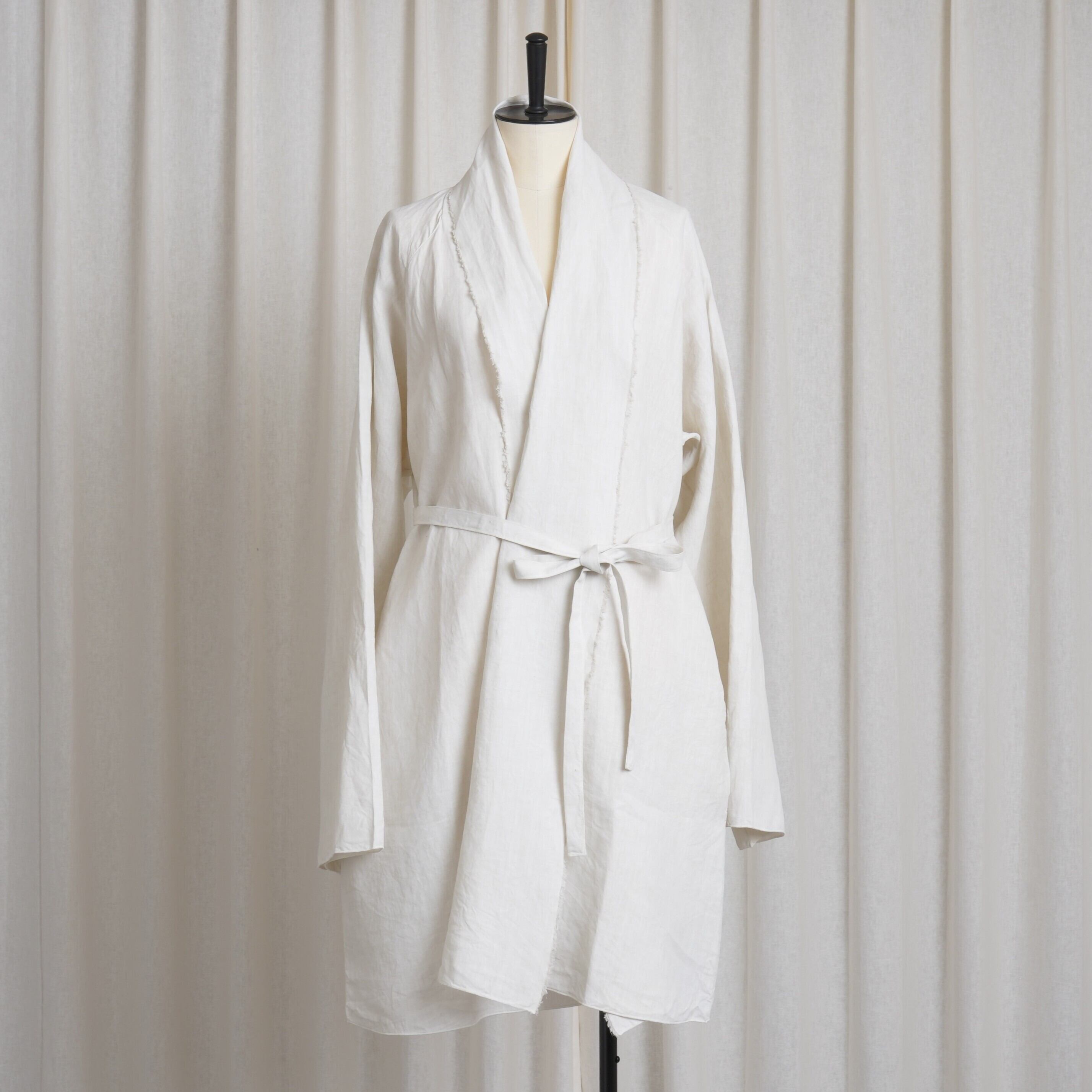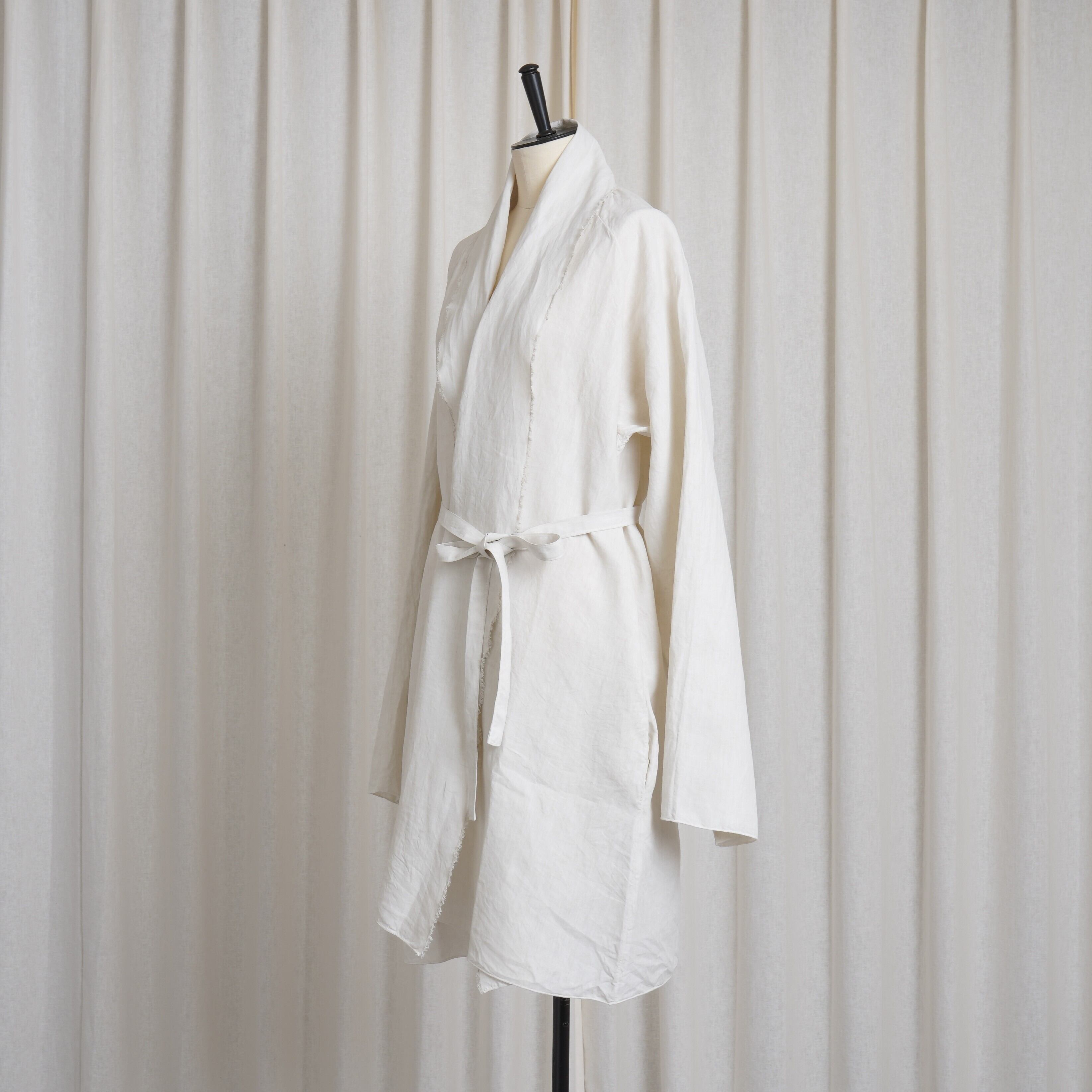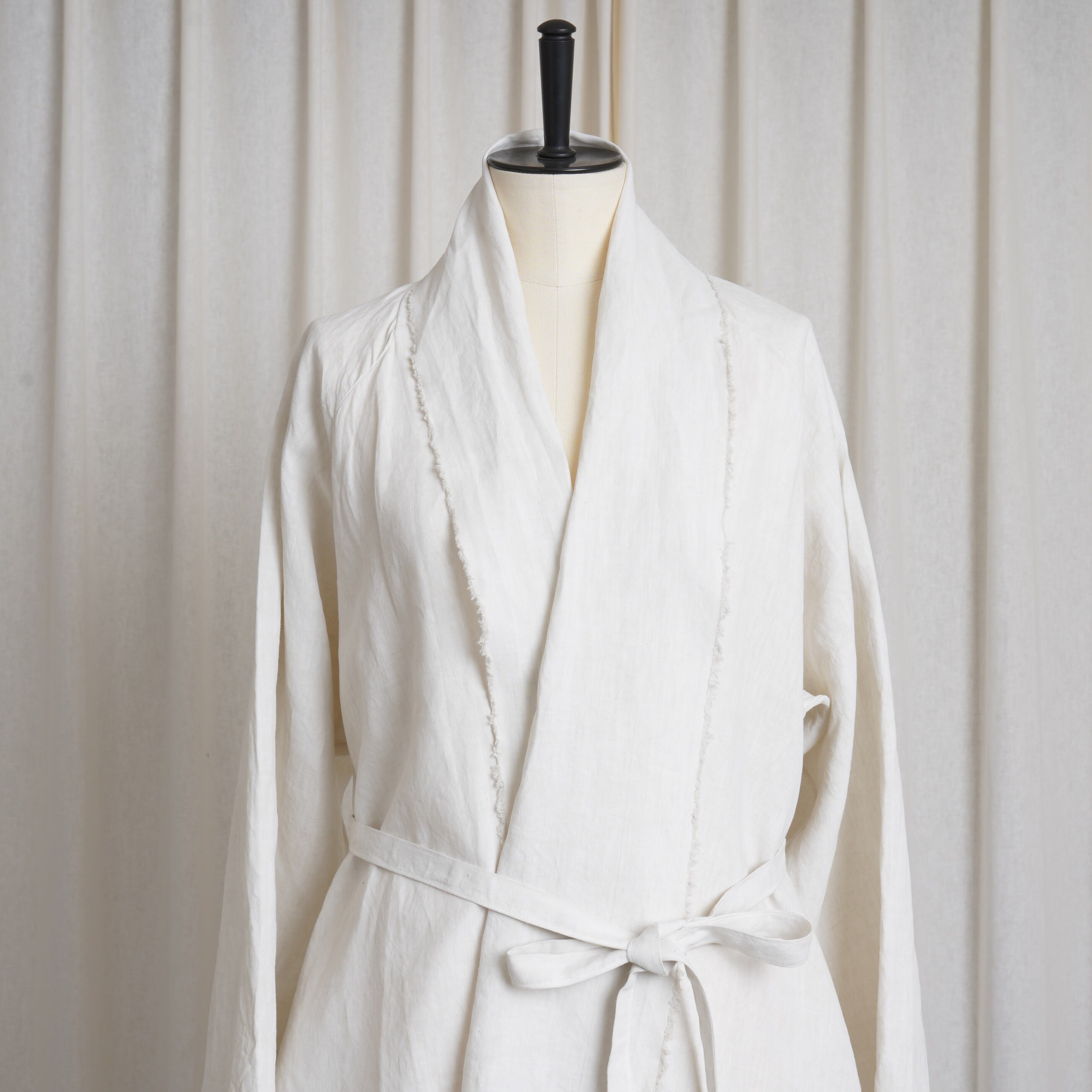 フロントにボタンは付けず、裾まで伸びる衿がストンと落ちるミニマルなデザイン。付属の共布の腰紐で前を留めることで、コートのようにも、ガウンのようにも着用いただけます。