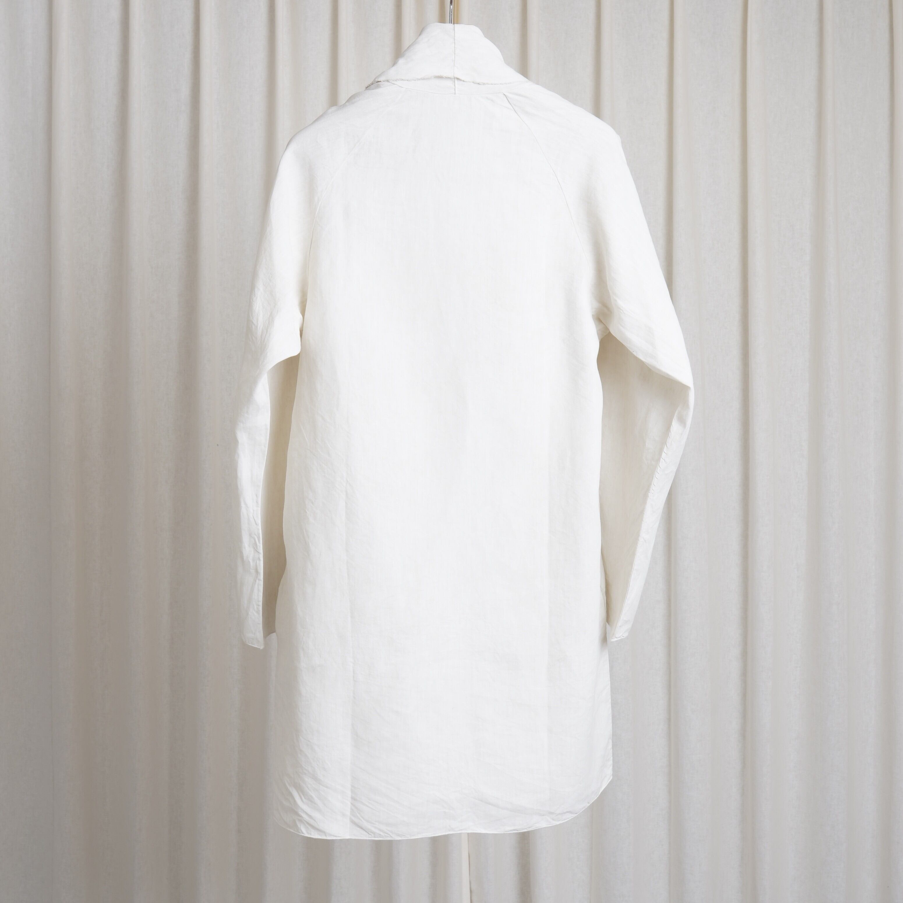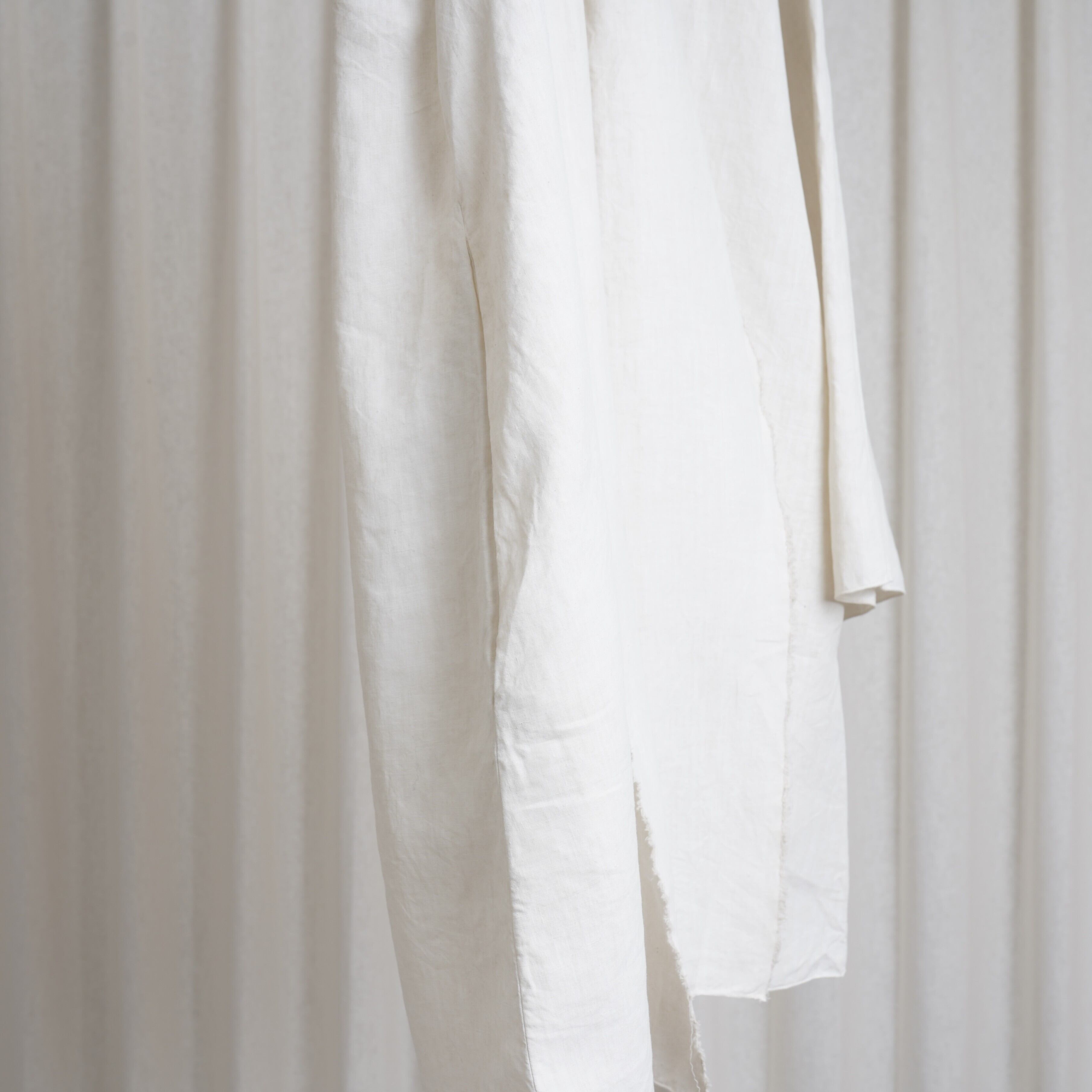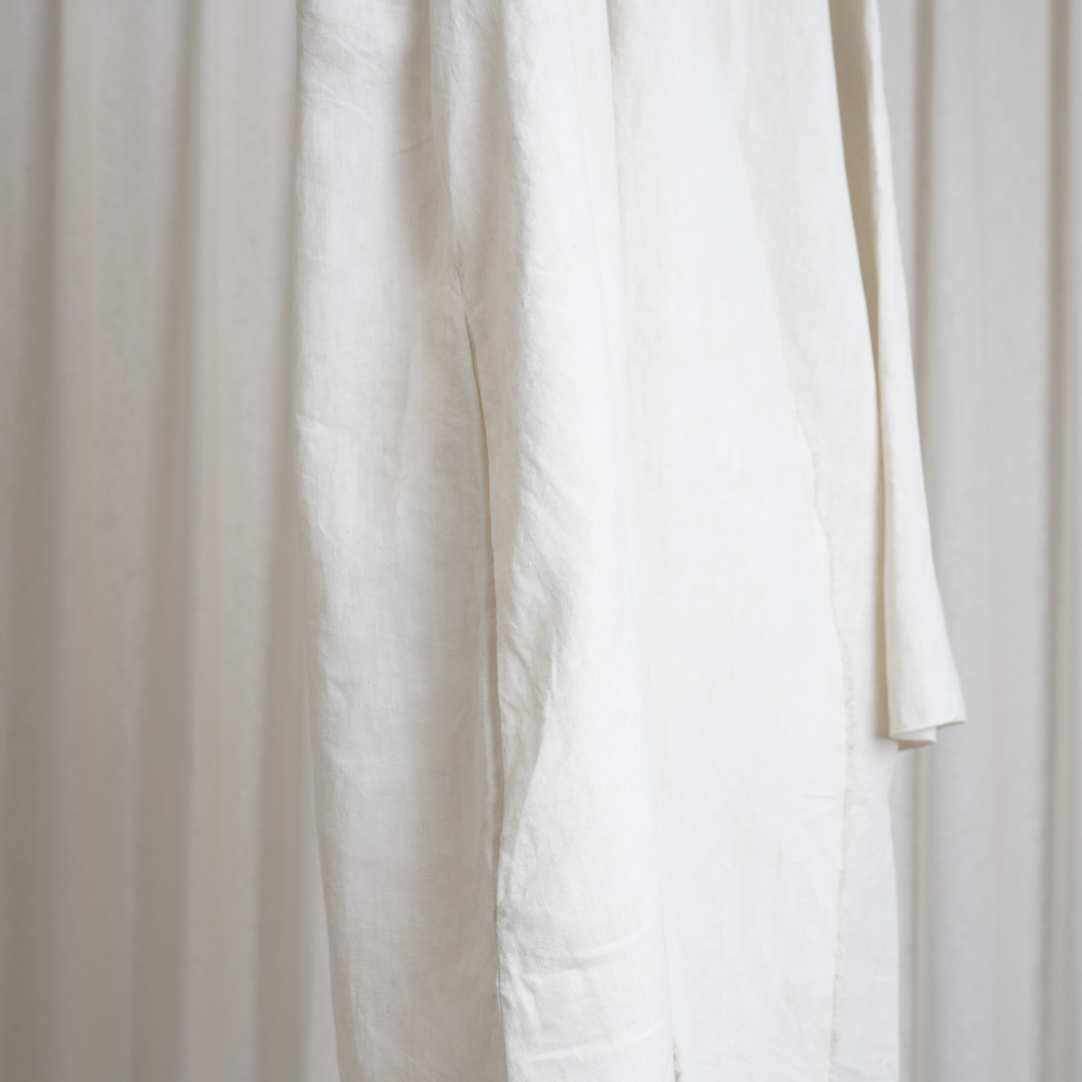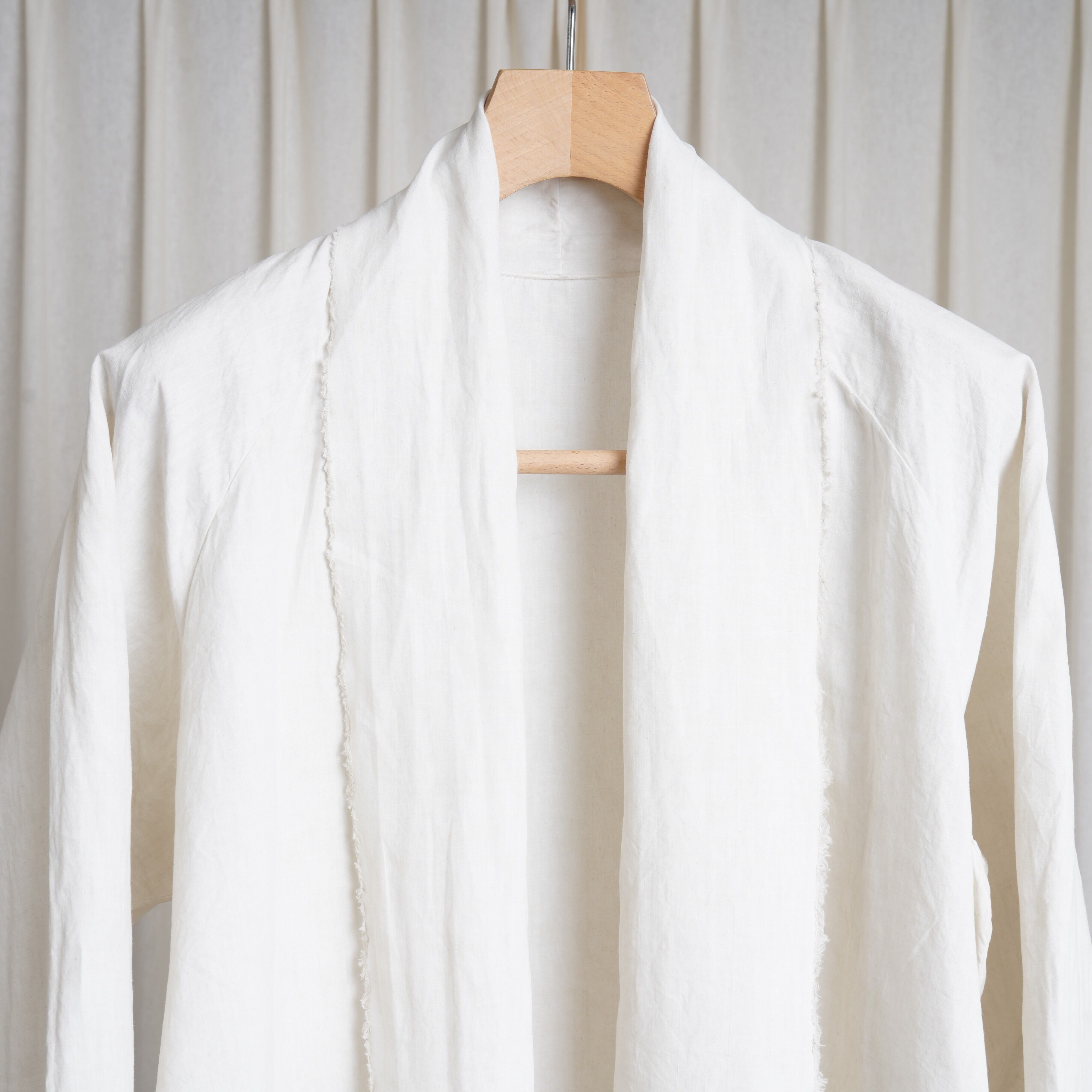 フロントにボタンは付けず、裾まで伸びる衿がストンと落ちるミニマルなデザイン。付属の共布の腰紐で前を留めることで、コートのようにも、ガウンのようにも着用いただけます。