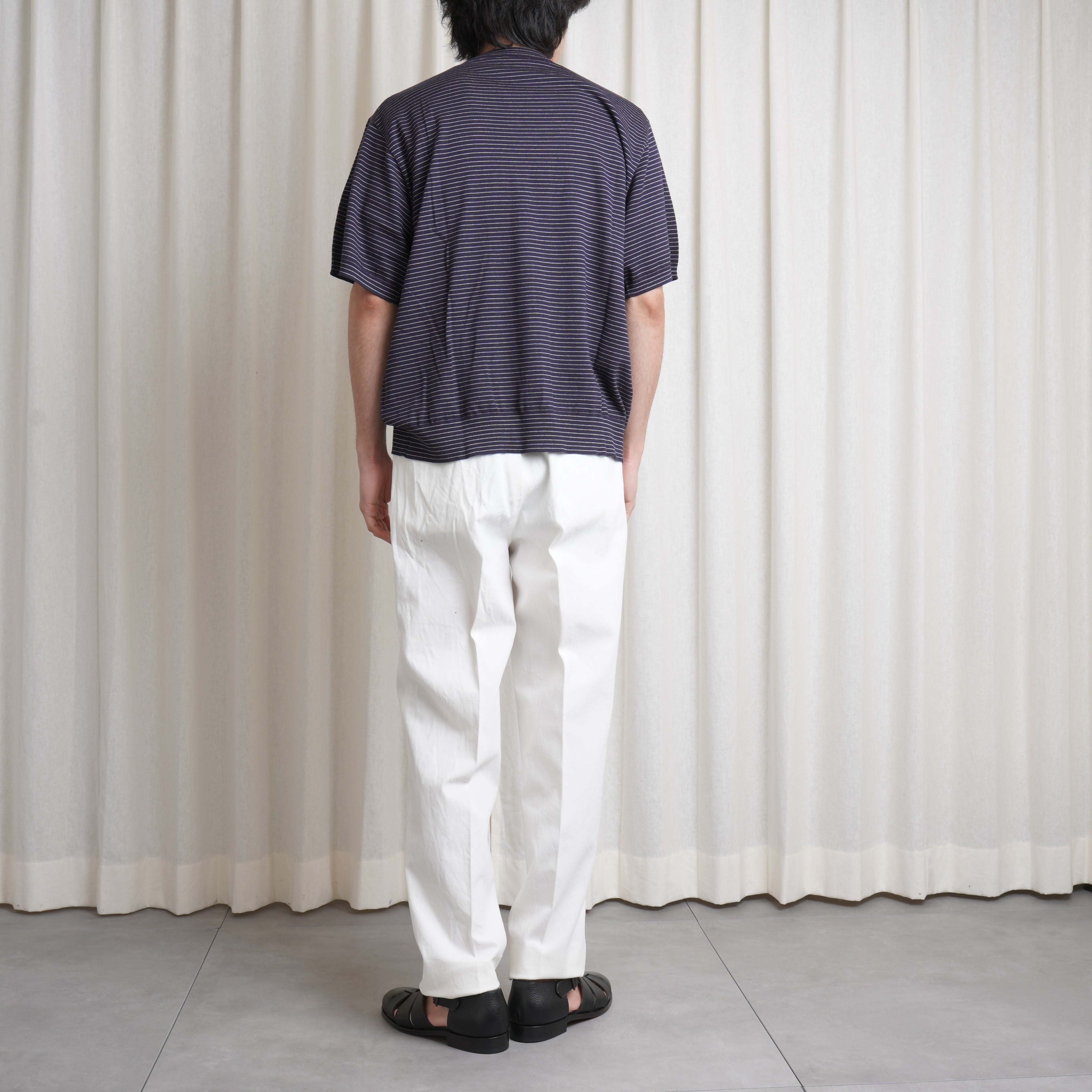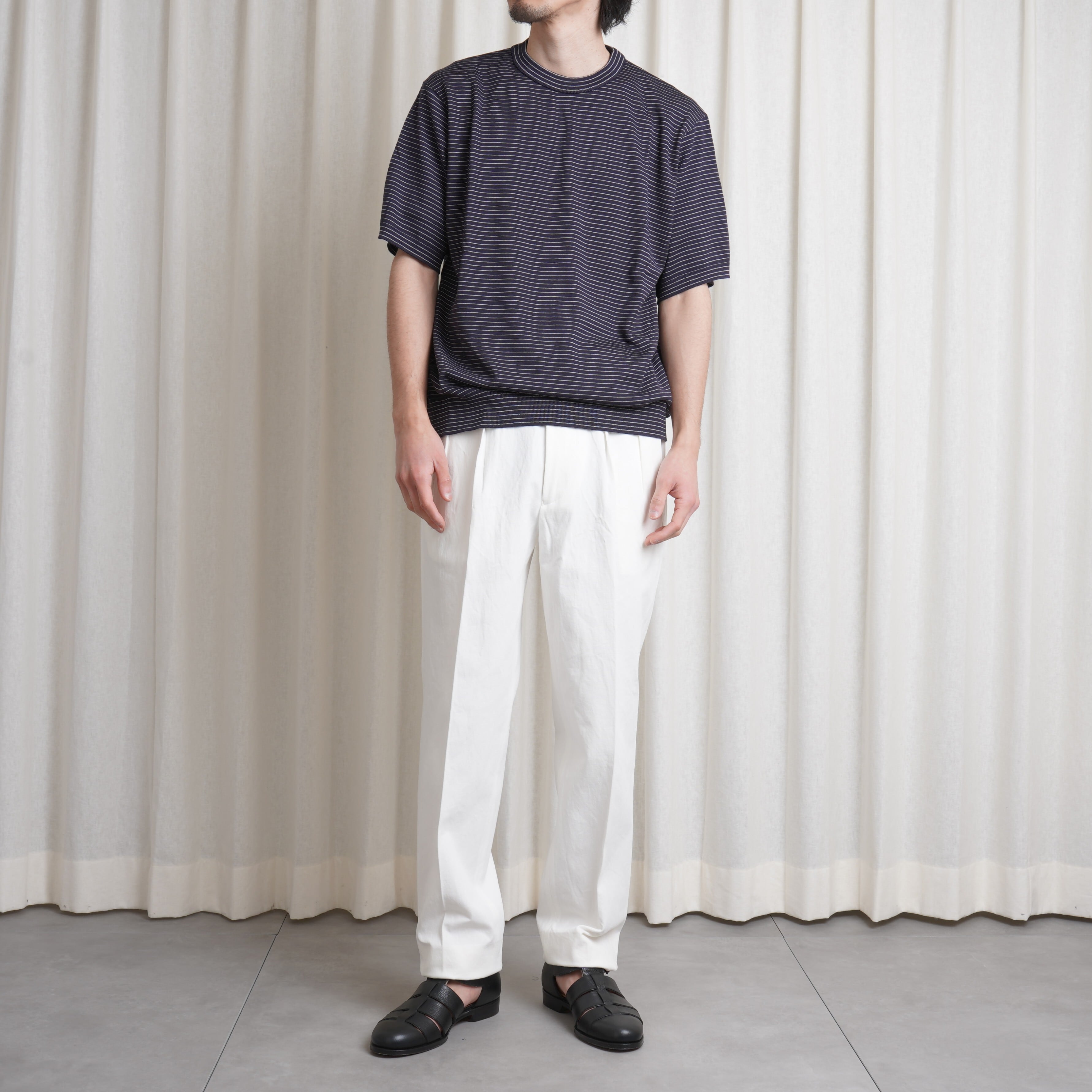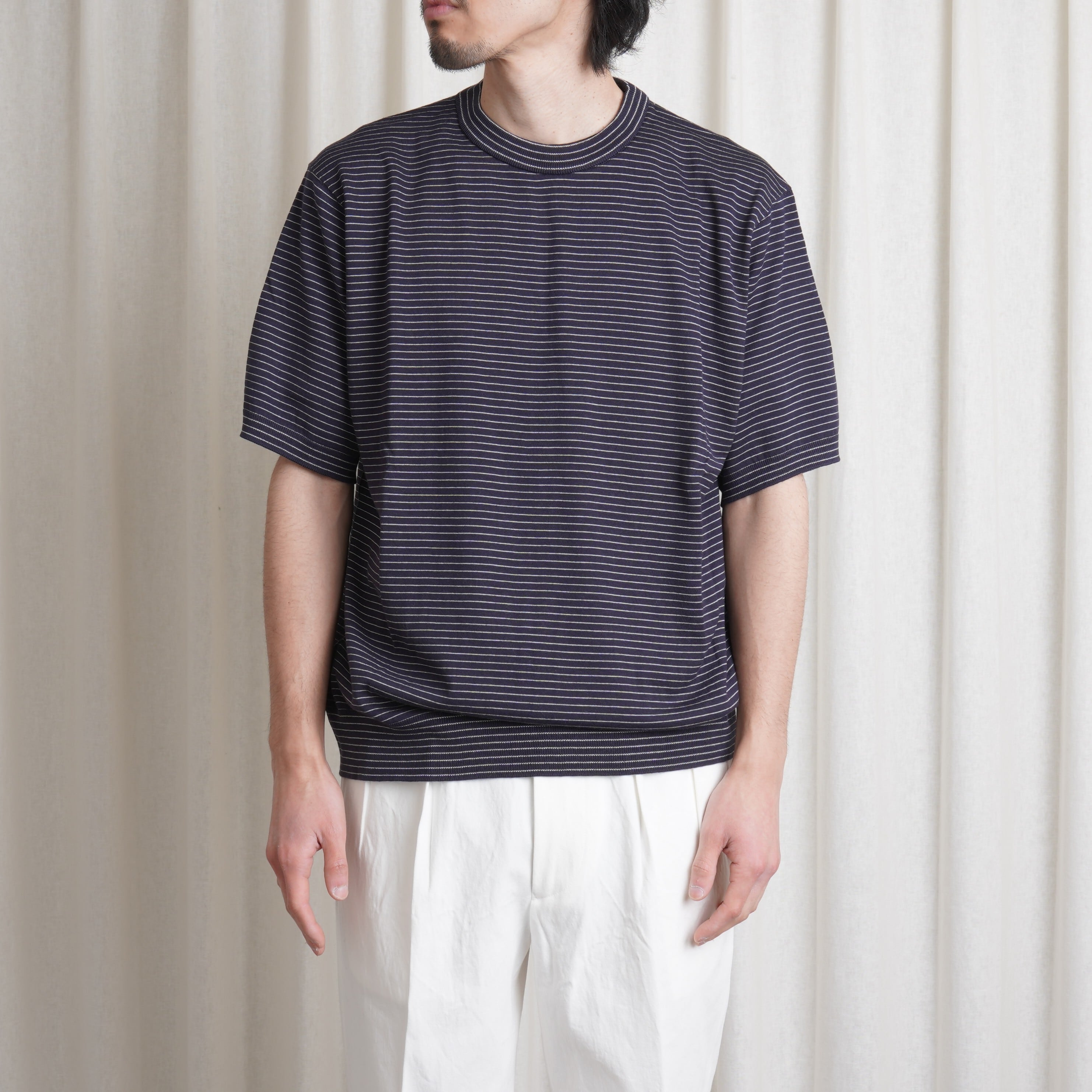 ベーシックなクルーネックのウールTEEです。全体的に適度なゆとりを持たせたサイジングでリラックスした印象に仕上げられております。裾や袖のリブデザインによって、ハイゲージニットのようなルックスに仕上げられており一枚着のトップスとしての汎用性が非常に高いのもポイントです。