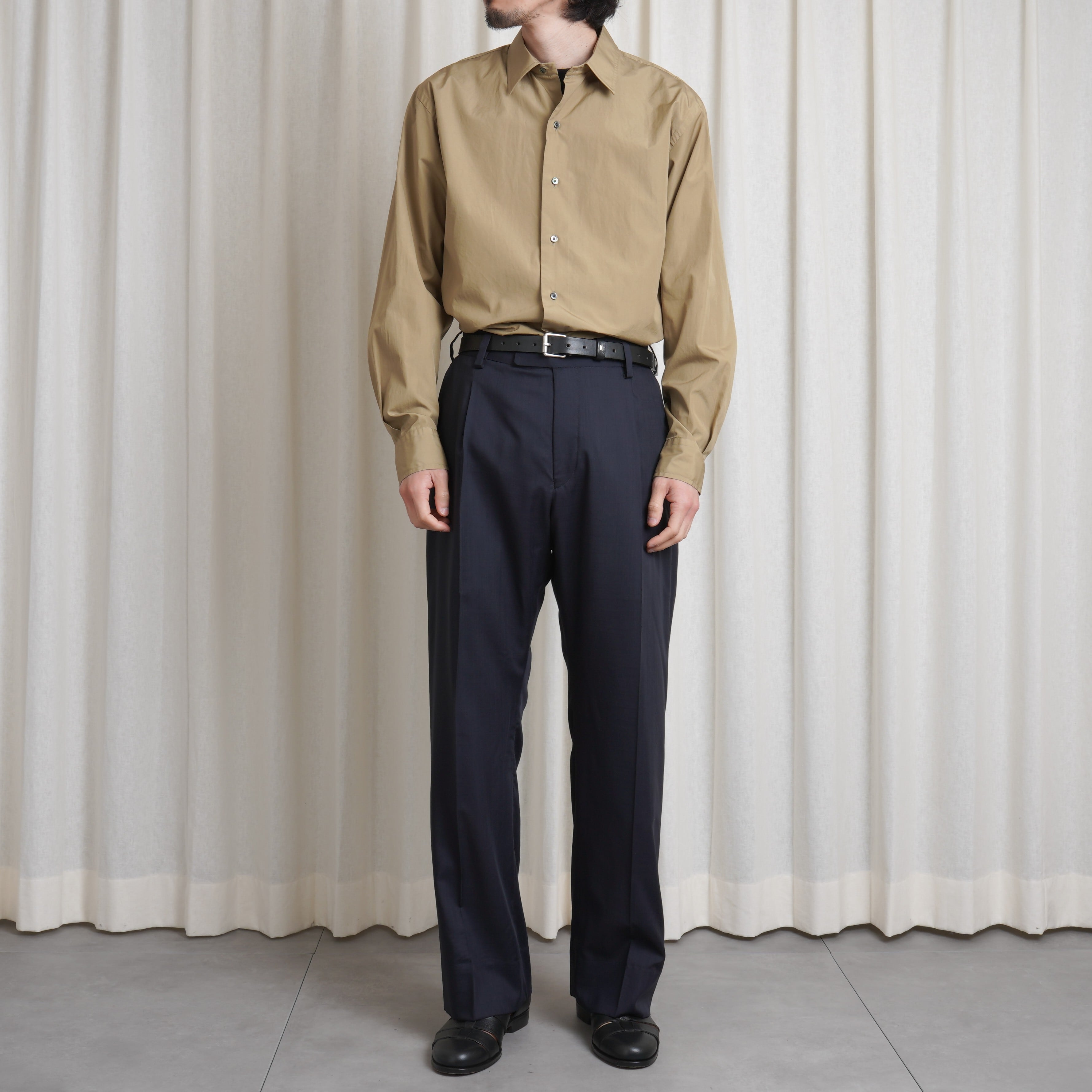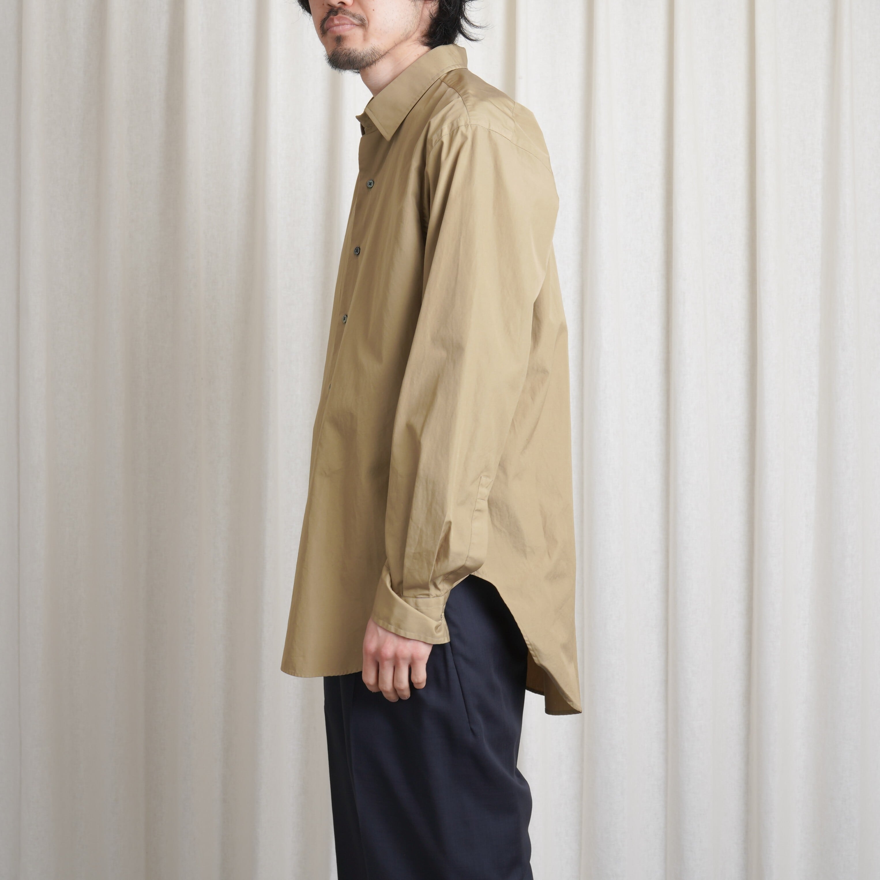 製品染めによるオリーブみあるベージュの色合いは、デザイナー・小山氏が所蔵する某メゾンのアーカイブから着想を得たもの。