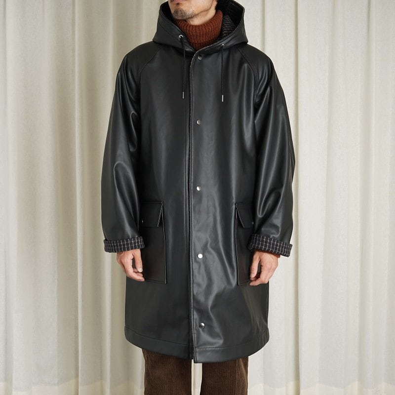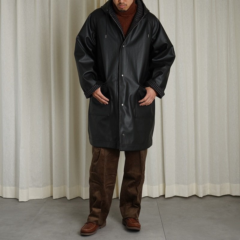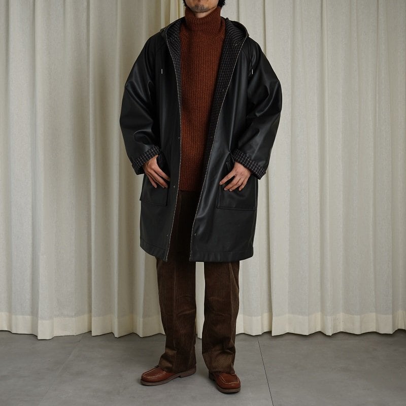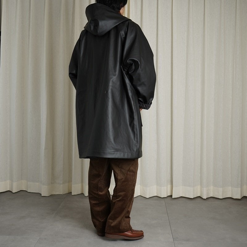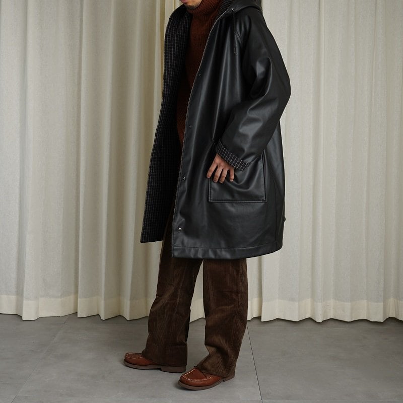 リバーシブルのフーデッドコート。ラグランスリーブで広めのカマ底、ゆったりとした身幅でリラックス感あるシルエット。丈も膝上程度の為とても取り回しが良い丈感です。奇麗に立ち上がるボリューム感あるフードは顔周りの印象をすっきり見せてくれます。フロントフラップポケットやブランドロゴ入りのスナップボタンなど拘りのディテール群。表地のコーティング生地の無骨なムードと裏地のウールチェック生地のエレガントなムードの掛け合わせがなんともHEUGNらしい迫力のあるアイテムです。