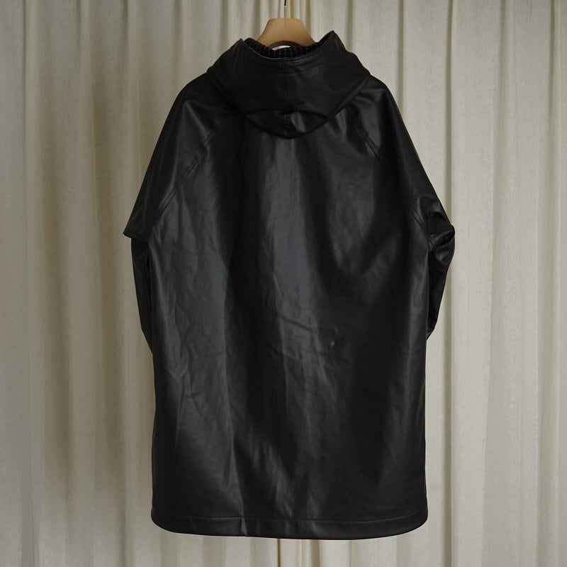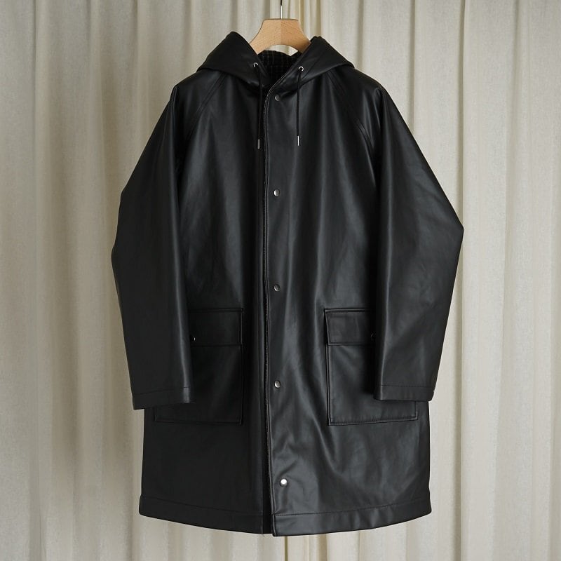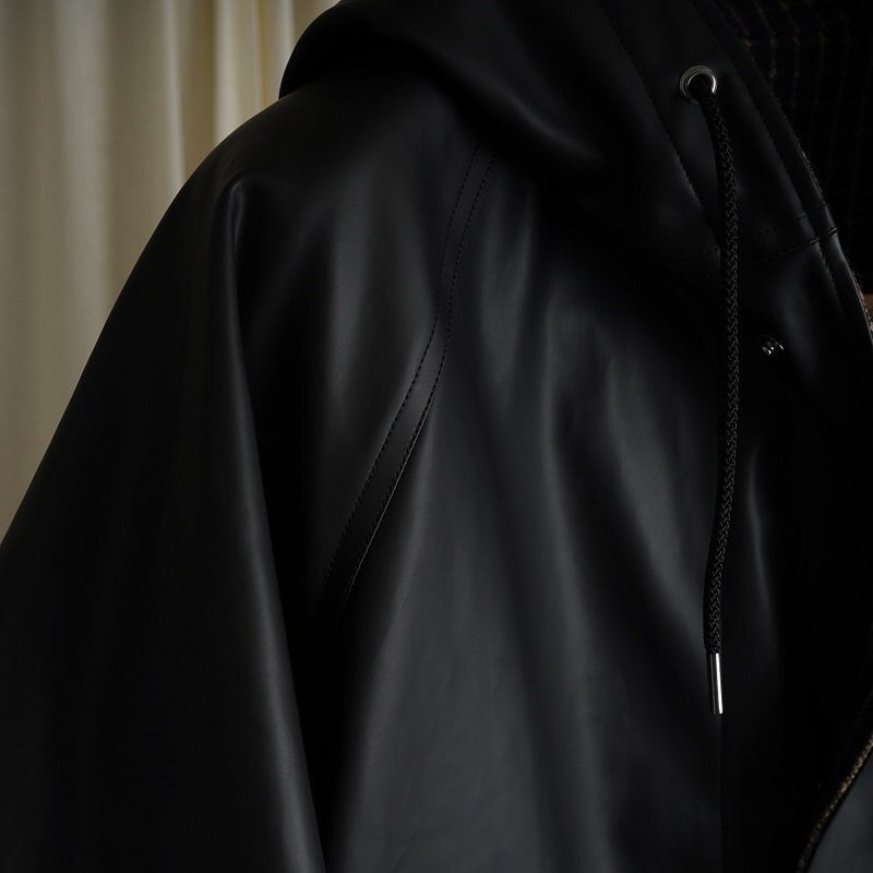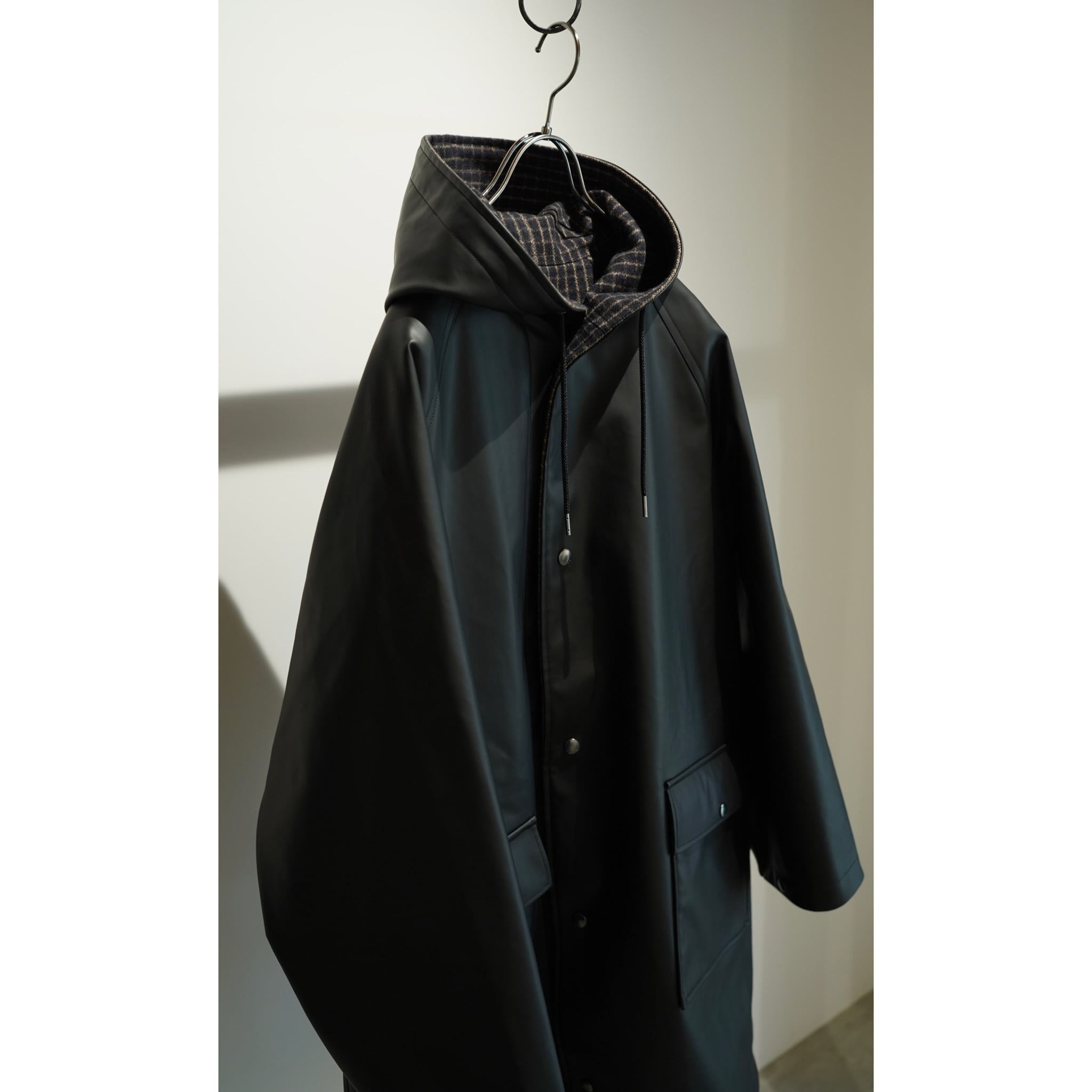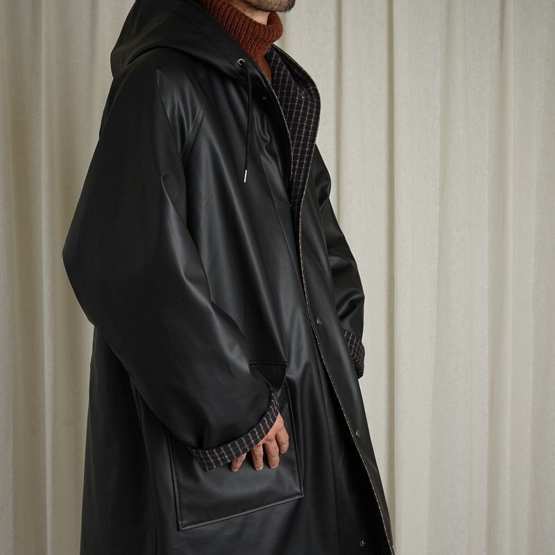 リバーシブルのフーデッドコート。ラグランスリーブで広めのカマ底、ゆったりとした身幅でリラックス感あるシルエット。丈も膝上程度の為とても取り回しが良い丈感です。奇麗に立ち上がるボリューム感あるフードは顔周りの印象をすっきり見せてくれます。フロントフラップポケットやブランドロゴ入りのスナップボタンなど拘りのディテール群。表地のコーティング生地の無骨なムードと裏地のウールチェック生地のエレガントなムードの掛け合わせがなんともHEUGNらしい迫力のあるアイテムです。
