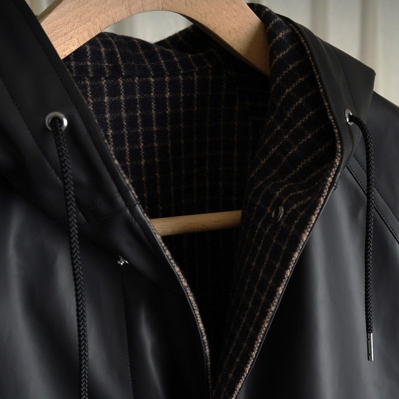 表地に北陸産地の合繊維メーカーの透湿性のあるコーティングファブリックを採用し、より日常的に使いやすいアレンジを施しております。また、裏地には尾州産地でHEUGNが別注をかけて製作したウール100%のチェック生地を採用しております。