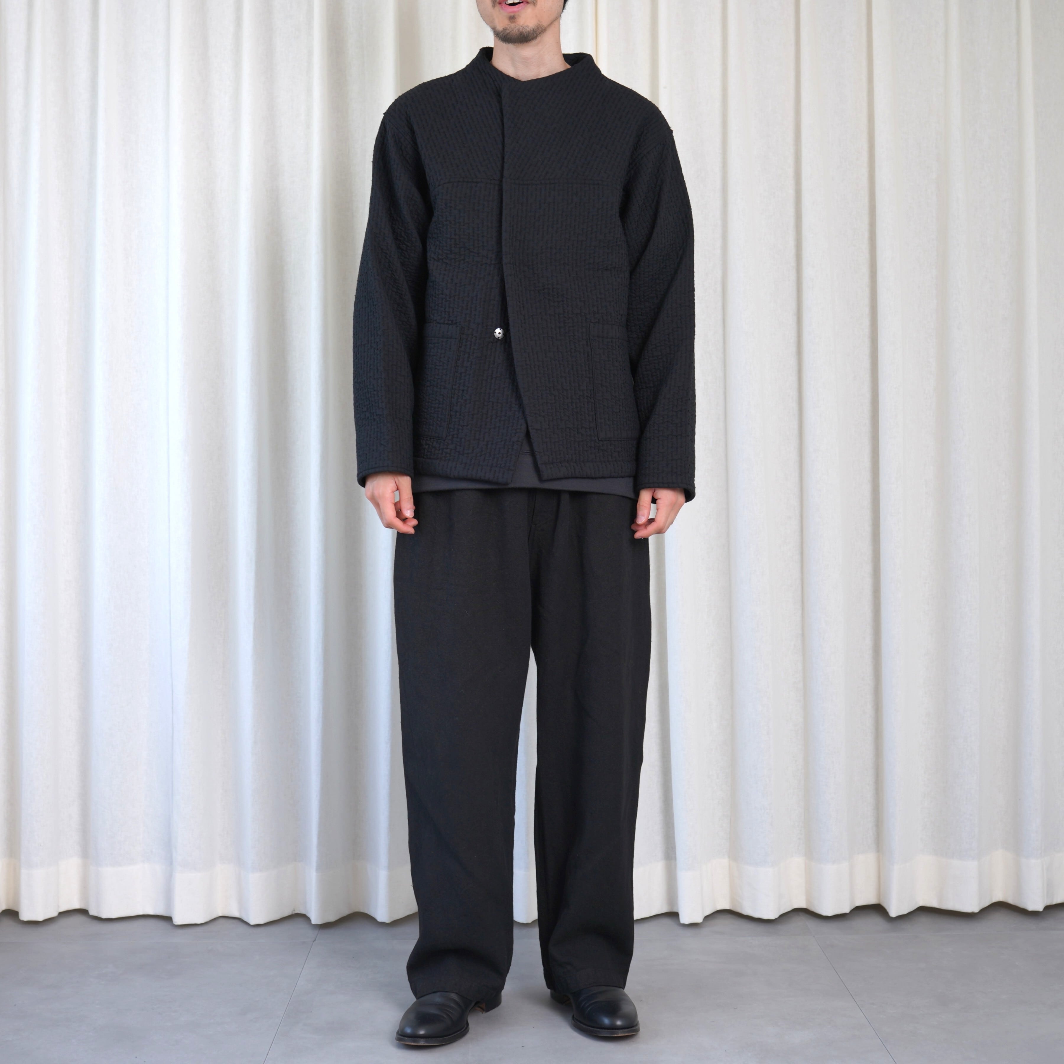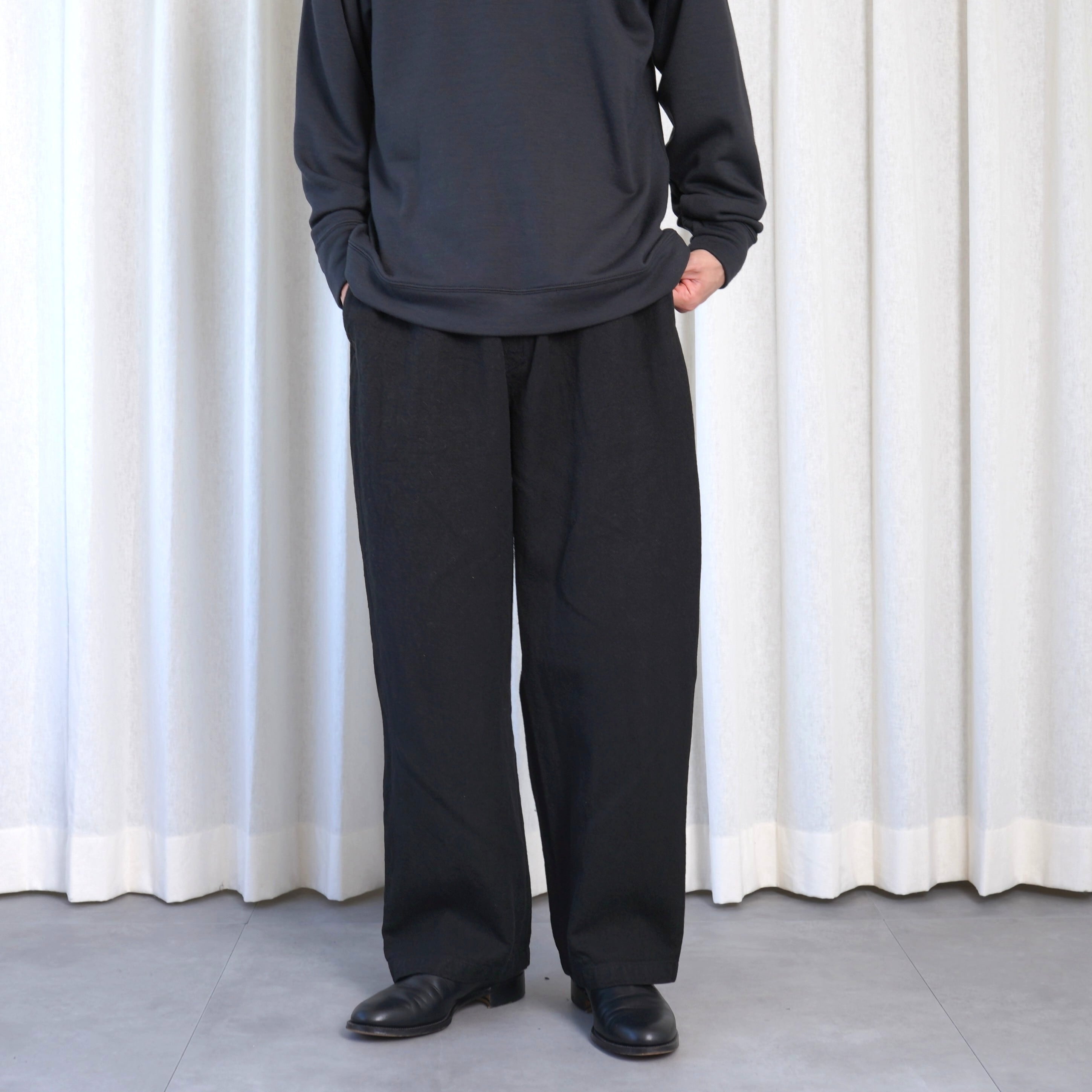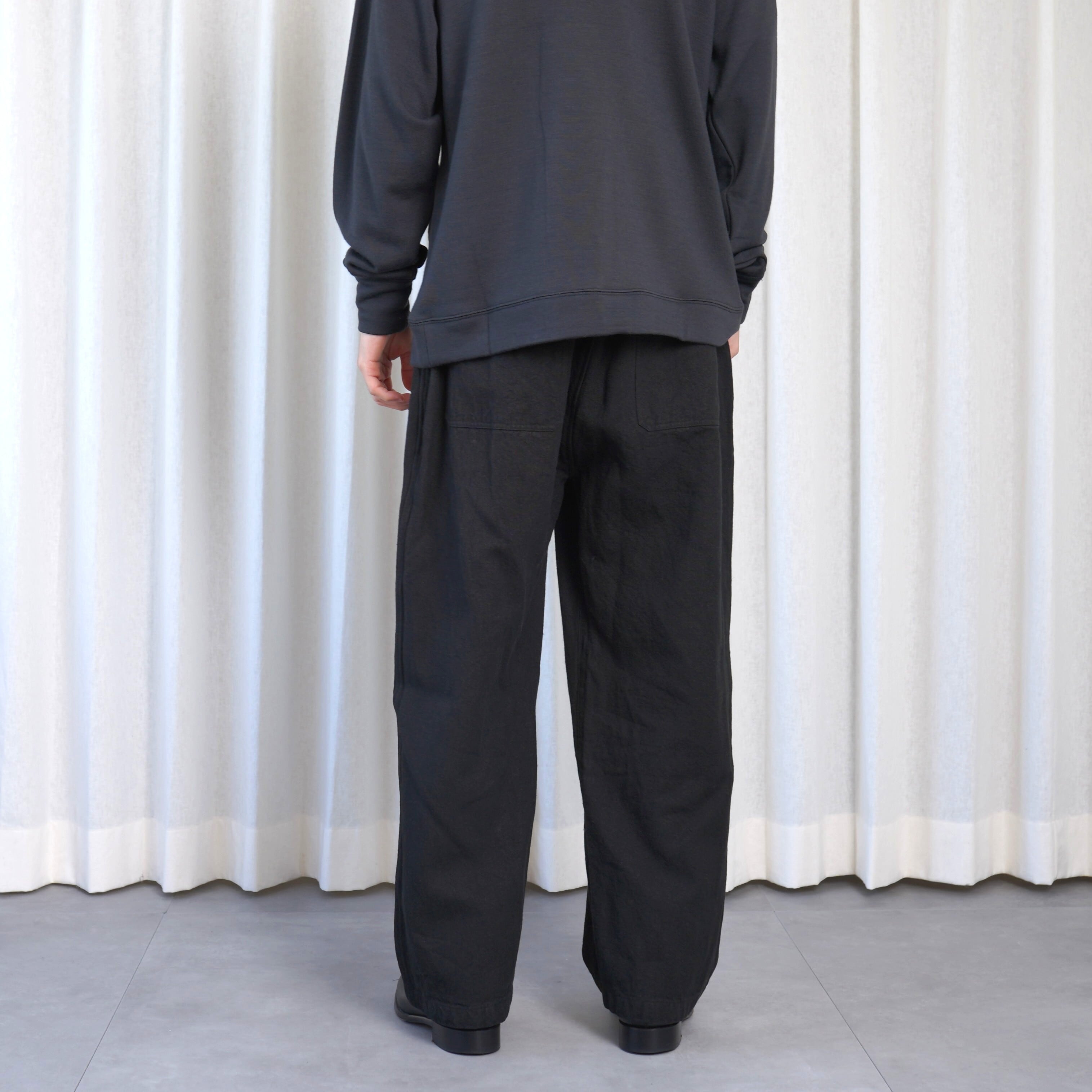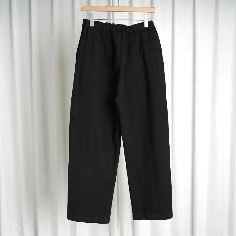 しっかりと重さがある生地なので自重に耐えられるようにベルトループが付いていますが、ウエストゴムと内側のオーガニックコットンの紐で、ベルトを用いなくても着用が可能です。パターンはPT-13をベースに、裾幅を太くしたストレートシルエットとし、後ろポケットも若干大きくしています。裾幅を太くした分全体のバランスを考えて、丈を5cmほど短くしています。またインナーを調整する事で一年中着用が可能です。
